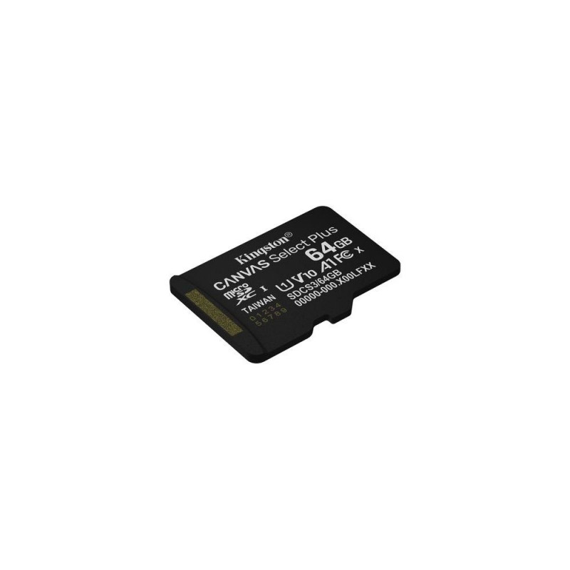 <b>with Android A1 Performance Class</b><br>Kingston’s Canvas Select Plus microSD card offers reliable performance, compatible with Android devices and cameras, with speeds up to 150MB/s*. With A1 app performance, it ensures smooth multitasking and fast load times. Durable and versatile, it’s perfect for everyday storage needs.<br><br>Kingston’s Canvas Select Plus microSD is compatible with Android devices and designed with enhanced A1-rated performance. It offers reliable speed and large capacites for faster app loads and capturing images and videos in capacities up to 1TB**. Powerful in performance, speed, and durability, the Canvas Select Plus microSD is designed for reliability so you can take them anywhere with confidence that your photos, videos, and files will be protected. Available with a lifetime warranty.<br><br><b>Impressive Speeds</b><br>Incredible read speeds up to 150MB/s*<br><br><b>Optimised for use with Android devices</b><br>Enhanced Android A1 Performance Class<br><br><b>Large capacities</b><br>Capacities up to 1TB** to store your photos and files.<br><br><b>Durable</b><br>For peace of mind, cards are extensively tested and proven to be waterproof, temperature proof, and X-ray proof.***Kingston Technology 64GB micSDXC Canvas Select Plus Gen3 100R A1 Single Pack w/o ADP. Capacity: 64 GB, Flash card type: MicroSDXC, Flash memory class: Class 10, Internal memory type: UHS-I, Read speed: 100 MB/s, UHS Speed Class: Class 1 (U1), Video Speed Class: V10. Product colour: Black