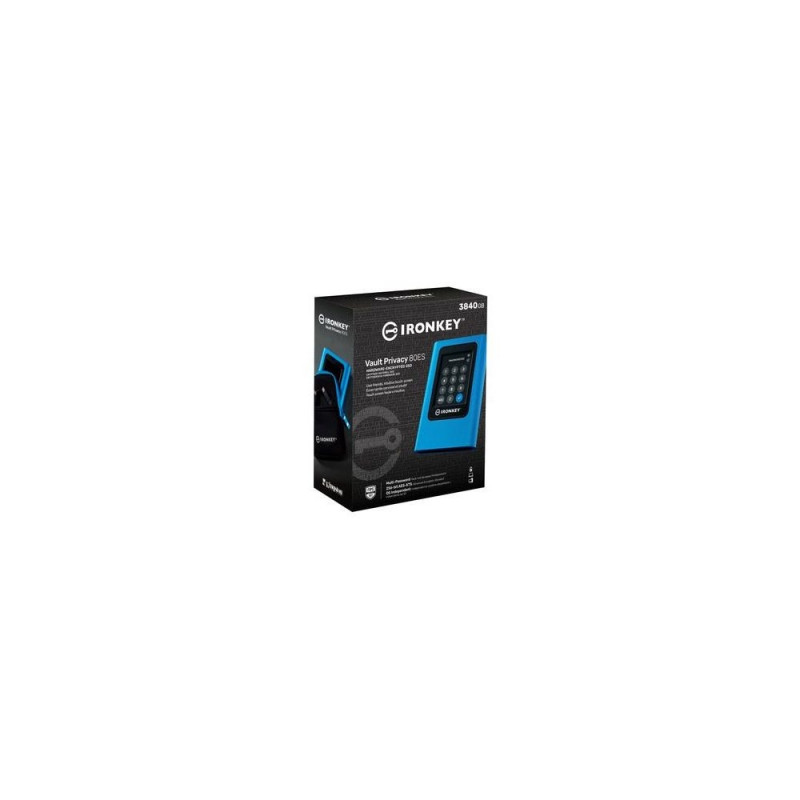 Kingston IronKey Vault Privacy 80 External SSD is Kingston’s first innovative OS-independent hardware-encrypted external SSD with touch-screen for data protection. VP80ES safeguards against Brute Force attacks and BadUSB with digitally-signed firmware. Brute Force attack protection crypto-erases the drive if the Admin and User passwords are entered incorrectly 15 times* in a row by default. The drive is FIPS 197 certified with XTS-AES 256-bit encryption using a Common Criteria EAL5+ (CC EAL5+) certified secure microprocessor, and is TAA compliant.<br><br>As innate as unlocking a smartphone and simple drag & drop file transfers, VP80ES is designed to protect data while being user-friendly. Featuring an intuitive colour touch-screen and multi-password (Admin and User) option with numeric PIN or passphrase modes, Vault Privacy 80ES is superior to using the internet and Cloud services to safeguard data. <br><br>Whether it’s important company information, client documents or high-res images and videos, the drive is ideal for small-to-medium businesses (SMB) to content creators. It comes bundled with two USB 3.2 Gen 1 adapter cables, USB Type-C®** to Type-A and Type-C to Type-C, to allow for easy connection to computers and other devices. VP80ES makes for the perfect companion when you need secured data and content out in the field or on the go to enable portable productivity and convenience, all in the palm of your hand. It is ideal for regular data backup and protection against ransomware.<br><br>Admin can enable a User password and set up security options, such as configuring password requirements by setting the maximum number of shared attempts, minimum password length of 6-64 characters and alphanumeric password rules. Additionally, you can utilise the ‘space’ character, making it easier to remember a passphrase as a list of words, a memorable quote or lyrics from a favourite song. Otherwise, use the PIN pad to unlock just as you would on a mobile device, and reduce failed login attempts and frustration by tapping the “eye” button to view the password as entered. <br><br>As an added feature, when a User password is forgotten, the Admin password can be used to access data and restore User access.<br><br><b>Safeguard with FIPS 197 certified XTS-AES 256-bit encryption</b><br>Built-in protections against BadUSB, Brute Force attacks and Common Criteria EAL5+ certified secure microprocessor*<br><br><b>Unique Intuitive Touch-screen</b><br>Protecting your data is easy with the intuitive, user-friendly colour touch-screen.<br><br><b>Multi-Password (Admin/User) Option with PIN/Passphrase modes</b><br>Multi-Password Option for Data Recovery with Admin access<br><br><b>Configurable Password Rules</b><br>Manage the number of password attempts, minimum password length of 6-64 characters, and numeric or alphabet password rules.<br><br><b>Extended Security Options</b><br>Adjustable auto-timeout to lock drive, randomise touch-screen layout and Secure-Erase the drive to wipe out all passwords and encryption key.<br><br><b>Dual Read-Only (Write-Protect) Mode Settings</b><br>Defend against cybersecurity threats from compromised systems using two levels of Read-only protection. <br><br><b>Ideal for regular backups and protection against ransomware</b><br>Regular backups are the best practice to safeguard critical data against malware or ransomware.Kingston Technology IronKey 3840GB Vault Privacy 80 XTS-AES 256-bit Encrypted External SSD. SSD capacity: 3.84 TB. USB connector: USB Type-C, USB version: 3.2 Gen 1 (3.1 Gen 1). Read speed: 230 MB/s, Write speed: 250 MB/s. Password protection. Product colour: Blue