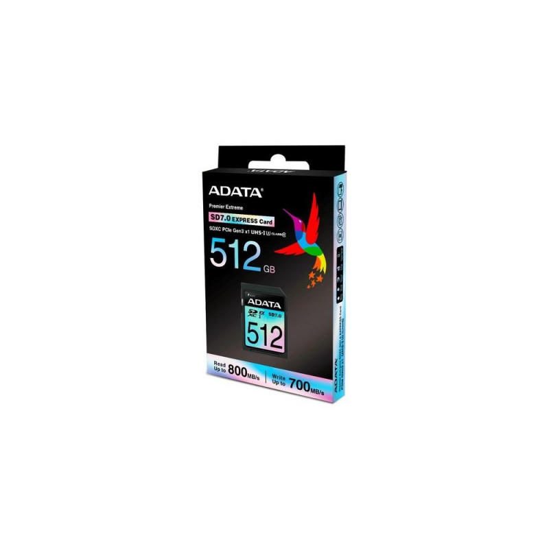 <b>Revolutionary Performance</b><br>With support for PCIe Gen3x1 and NVMe, this memory card delivers read and write performance of up to 800/700 MB/s, which is roughly 1.5 times faster than SATA SSDs. When compared to UHS-II SD cards and UHS-I SD cards, it's about 2.7 and 8 times faster, respectively.<br><br><b>Like an SSD, but Smaller</b><br>The Premier Extreme SDXC Express memory card is backward compatible with the UHS-I standard. It can be inserted into digital cameras to take high-quality photos or 4K videos, and then inserted into a PC that supports SD 7.0 for seamless editing or playback. It performs just like an external SSD, but much smaller.<br><br><b>Rated for V30</b><br>The Premier Extreme SDXC Express Card supports UHS-I video equipment, with a read and write speed of 100MB/s, and conforms to the V30 Video Speed Class. This means it's fully qualified to work with mainstream Ultra HD 4K video recording applications to help you create high-quality, pro-level content.<br><br><b>Lots of Storage Capacity</b><br>With capacities ranging from 256GB to 512BG, the Premier Extreme SDXC Express Card has plenty of space for all your content so you can create without limitations.<br><br><b>Secure, Durable, Reliable</b><br>Your data is safe with the Premier Extreme SDXC Express Card. It features error correcting code to ensure data accuracy. What's more, it's waterproof, shock-proof, x-ray-proof, static-resistant, and tested to operate optimally in high and low temperatures.<br><br><b>QuikTips: What is SD Express?</b><br>With ever higher quality audio and video content, creators have embraced SSDs with their high-speed access to content and applications on their PCs. SD Cards have traditionally been limited in this regard. With support for PCIe and NVMe, SD Express Cards have overcome these limitations. With PCIe Gen3 x1 (SD 7.0), the theoretical transfer speed of an SD Express Card is 985MB/s. In the future, with PCIe Gen4 x1 (SD 7.0/SD 8.0) a theoretical speed of 1970MB/s will be possible and with PCIe Gen4 x2 (SD 8.0) a theoretical speed of 3940MB/s will be possible.<br><br><b>QuikTips: How does SD Express works</b><br>SD Express Cards adopts the latest SD 7.0 specification and introduces PCIe & NVMe support to greatly improve read and write performance. Despite this, the form factor remains the same as ordinary SD Cards. SD Express Cards also support UHS-I and are backward compatible with existing UHS-I SD enabled devices. With their upgrade in performance, SD Express Cards are now comparable to external SSDs in performance with the added benefit of compatibility with SD 7.0 enabled devices.ADATA Premier Extreme. Capacity: 512 GB, Flash card type: SDXC, Flash memory class: Class 10, Internal memory type: UHS-I, Read speed: 800 MB/s, Write speed: 700 MB/s, UHS Speed Class: Class 3 (U3), Video Speed Class: V30. Protection features: Shock resistant, Static proof, Temperature proof, Waterproof, X-ray proof, Product colour: Black