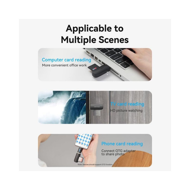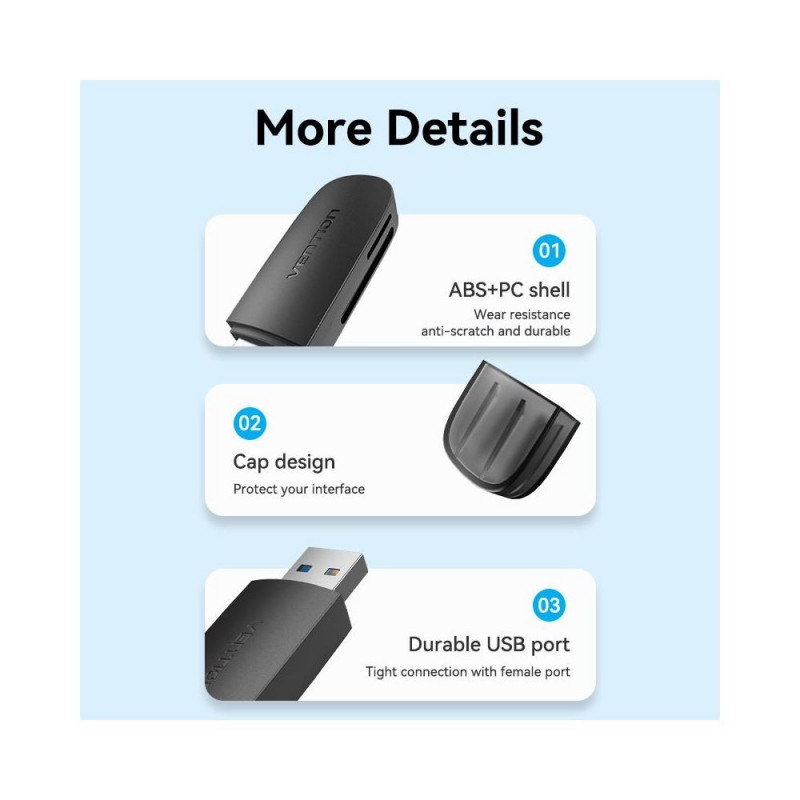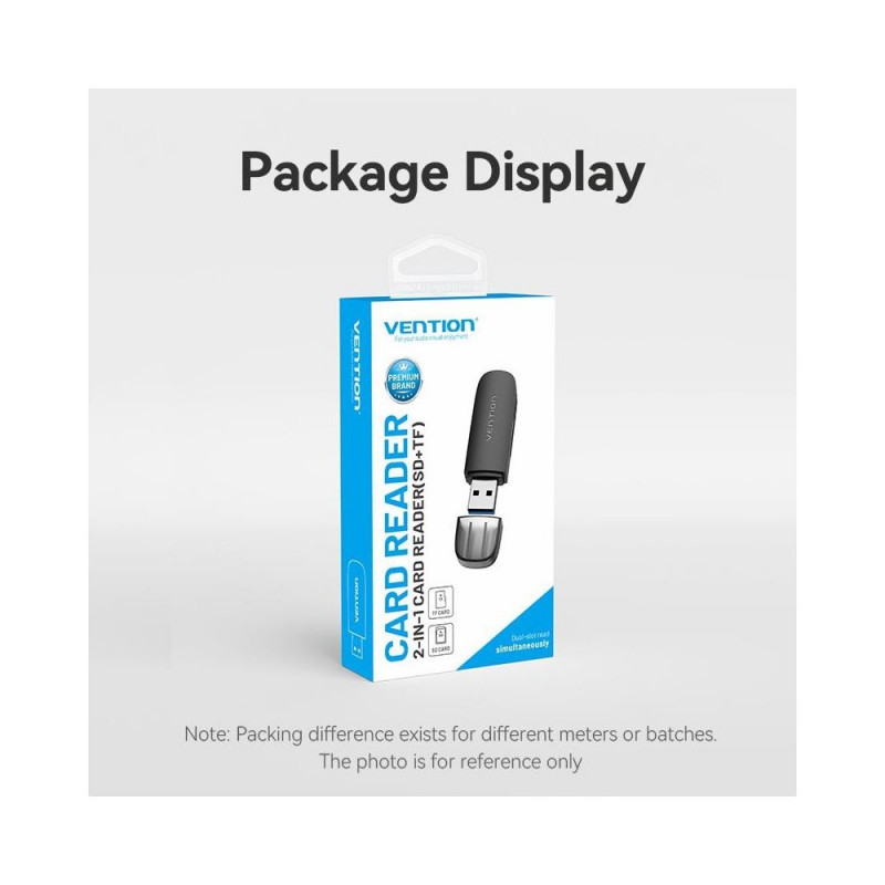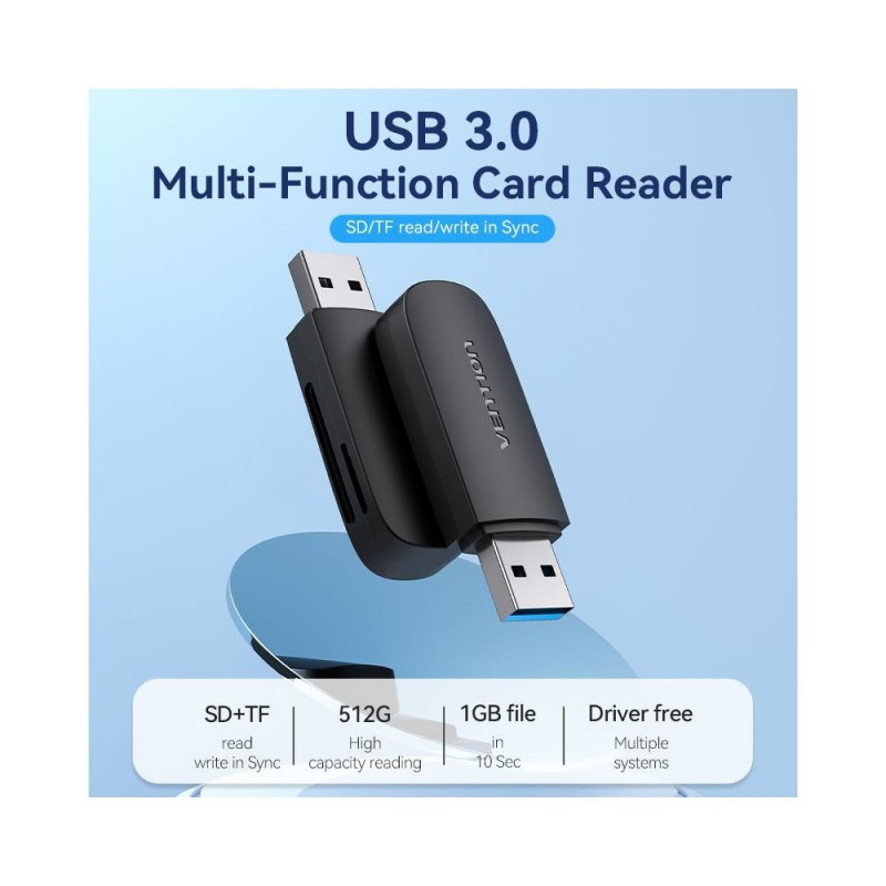 | Summary | Vention 2-in-1 USB 3.0 A Card Reader(SD+TF) Black Dual Drive Letter. Compatible memory cards: MicroSD (TransFlash), MicroSDHC, SDHC, MicroSDXC, SDXC, Product colour: Black, Data transfer rate: 5000 Mbit/s. Interface: USB 3.2 Gen 1 (3.1 Gen 1). Width: 20 m |