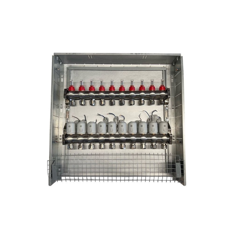 Komplekti kuulub: seinasisene metallkapp, 10-kontuuriline kollektor, vooluhulgamõõturid ja NC AC230V termomootorid.