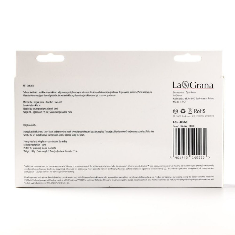 Tugevad käerauad lühikese ketiga ja eemaldatavate plüüskatetega, mis tagavad mugavuse ja kirgliku mängu. Reguleeritav läbimõõt (7 cm) võimaldab neid ideaalselt randmete ümber kohandada. Komplektis on võtmed, kuid neid saab avada ka hoova abil.