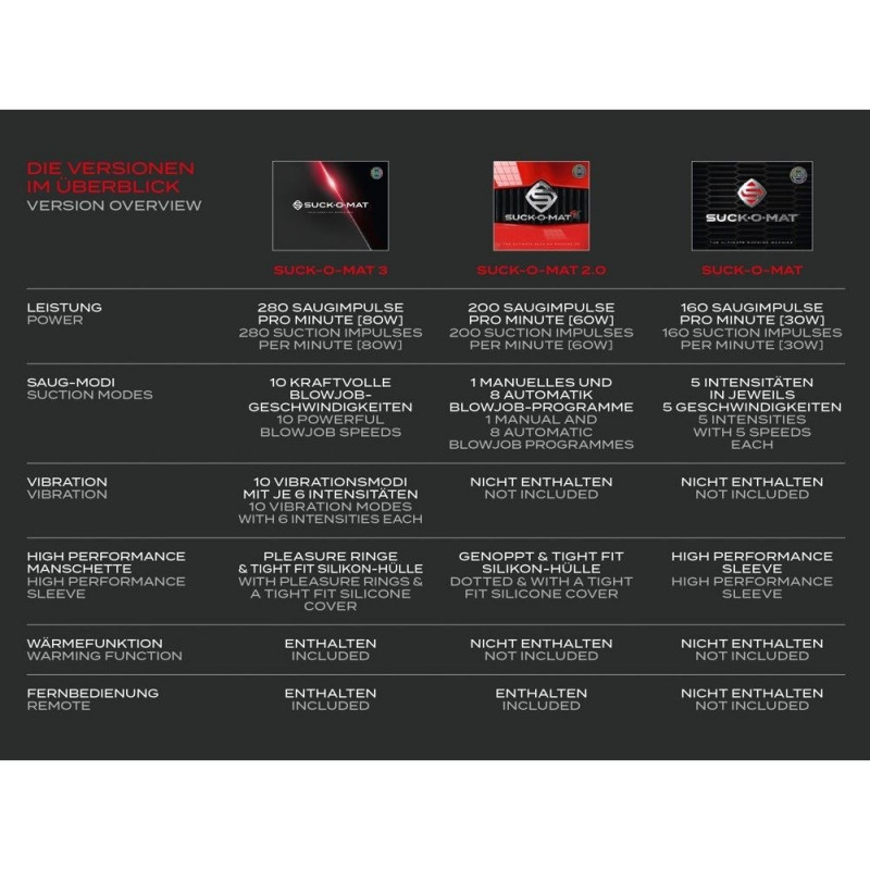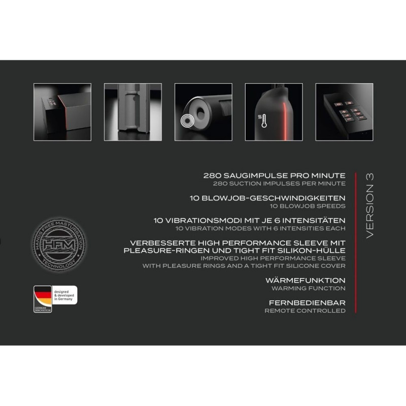 Võimas ja vaikne tehnoloogia on peidetud sportlikku ja elegantsesse disaini. Diskreetne punane LED-riba pulseerib sünkroonis seadme tööga. Tänu optimeeritud mootorile, mis saavutab kuni 280 pööret minutis, pakub Suck-O-Mat 3 lausa 100% rohkem võimsust kui tema eelkäija. Impulssimassaažiga imemismasin töötab vooluvõrgust (toiteadapter 230V Euro pistik, väljund 12V, 12,5A, 150W), tagades võimsa ja usaldusväärse pideva naudingu.