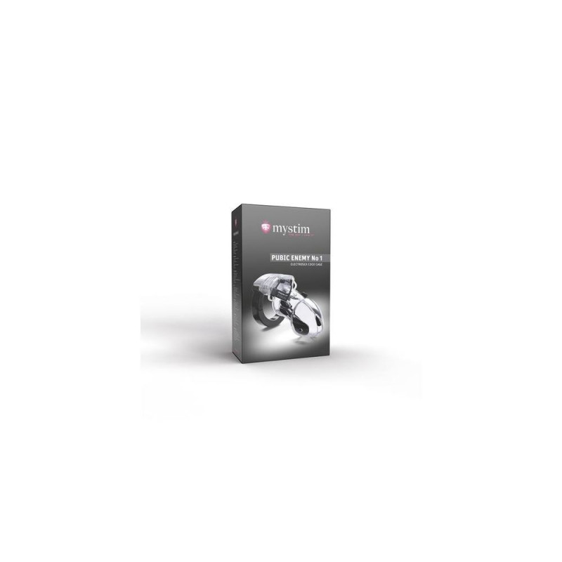 <b>Get yourself together, boy!</b><br><br>Your days of sexual liberty are over. The Pubic Enemy No1 will make sure, it’ll be noticeably restricted. Insubordinate rascals can be caught and locked away in this neat cock cage with e-stim function. It can only become hard when one takes pity on opening the restricting protective armor.<br><br><b>E-Stim</b><br><br>Persistent disorder must of course be punished. According to the mood of the caregiver and exactly in the intensity you deserve. Through the conductive surfaces on the left and right side of the cage, a gentle tingling, strong twitching or intensive pulsation passes through your best parts. You're already whimpering for mercy at the very thought of it? Well. you’re lucky. Since the conductive surfaces can be removed in no time, our e-stim chastity device is also suitable for stubborn first-time offenders. But don't you relax too soon. If you become so insolent as a prisoner that only electricity can help, the conductive surfaces can simply be reinstalled.<br><br> <b>Size</b><br><br>Well, do you match the famous 20cm? Don’t worry - Pubic Enemy No 1 most certainly will fit your member, as well. The length can be individually adjusted in four steps and the diameter of the clamp can be fixed to six different sizes. No need to puss out just now.<br><br><b>Scope of supply</b><br><br>Hard shell, hard core: The Pubic Enemy No 1 and its accessories are discreetly and securely stored in an elegant hard-shell case. In addition to the cock cage (including the conducting surfaces) the scope of delivery also includes the detailed instructions in seven languages and the matching 2 mm long cable for connection to the Mystim stimulation current devices.<br><br><b>Intensified imprisonment</b><br><br>No way of escaping: A metal lock with engraved Mystim emblem and a set of five plastic disposable seals would convict you immediately. And we thought about forgetful subs with a stack of signs including the writing "Hands off! This prisoner belongs to ___". Sliding into the cock cage holder, each plate reminds you to whom the contents of the cage belong.Mystim Pubic Enemy No 1. Product type: Penis chastity, Product colour: Transparent, Material: Plastic, Silicone. Width: 33 mm, Height: 82 mm. Quantity per pack: 1 pc(s)