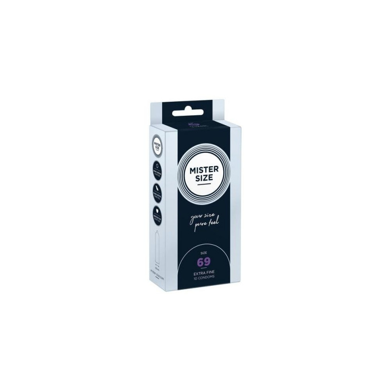 <br />MISTER SIZE 69. Type: Male condom, Surface texture: Smooth, Product colour: Transparent. Width: 69 mm, Length: 220 mm, Material thickness: 0.06 mm. Quantity per pack: 10 pc(s)