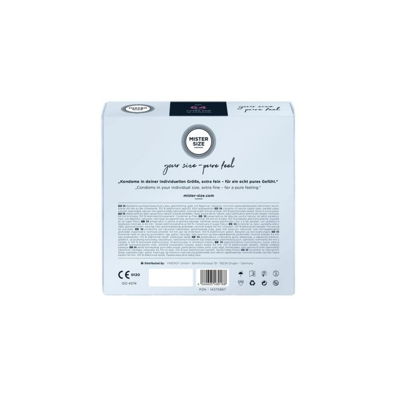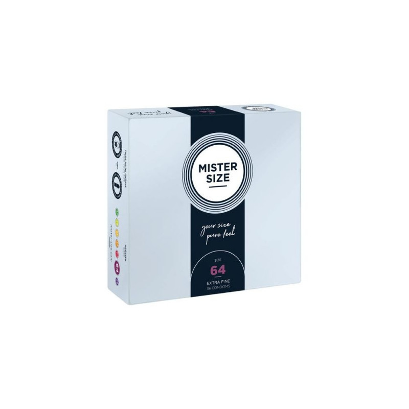 <br />MISTER SIZE 64. Type: Male condom, Surface texture: Smooth, Product colour: Transparent. Width: 64 mm, Length: 220 mm, Material thickness: 0.06 mm. Quantity per pack: 36 pc(s)
