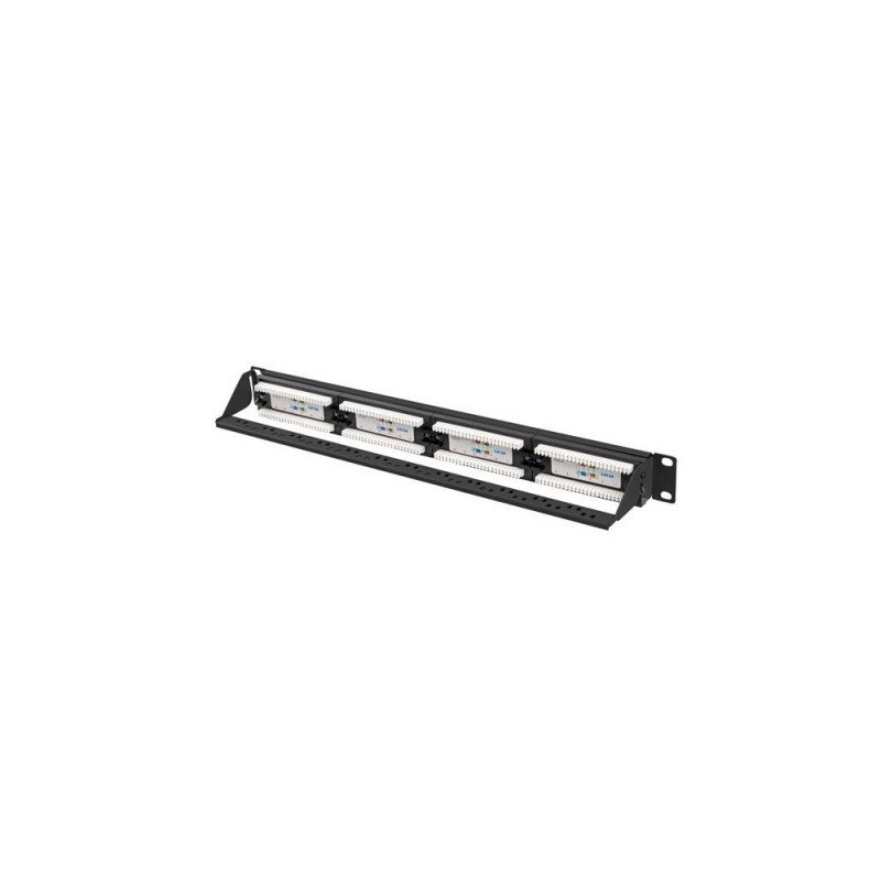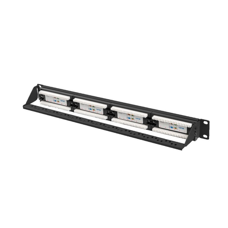 It is a passive part of structured cabling used for termination and organization of twisted-pair cables within 19" rack cabinets. Patch panels is equipped with 24 unshielded RJ-45 ports category 6a.