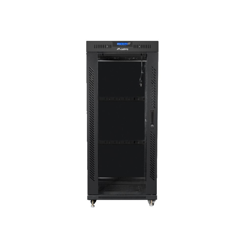 The Lanberg cabinet also includes lockable top and bottom panels with blanking panels, enabling convenient cable entry and concealment. This ensures a neat and well-organized installation, minimizing cable clutter. Additionally, the cabinet features front doors with tempered glass and a lock, as well as rear steel doors. It offers the option for right or left-side door installation. The side panels are removable (with locks included), and the rear doors are made of sturdy steel with a lock. The cabinet is also equipped with a front-mounted LCD display with a thermostat function, providing essential information such as internal temperature, current time, and fan status.