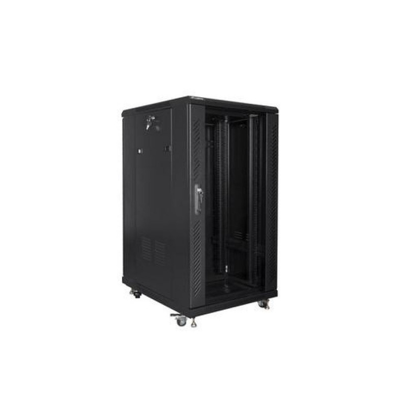 Free standing Lanberg cabinet FF01-6822-12B is a solution designed to expand networks, installation of cabling and equipment in size 19” with max. 800kg. loading capacity. It can be used in networks, server rooms, small, medium businesses and data centers which needs lot of space in cabinet for network equipment's. It can also work in low voltage systems such as cable television networks, alarm systems, fire protection systems and access control systems, CCTV and IP surveillance. Construction is made of high grade cold rolled steel which characterized by excellent design and high quality of craftsmanship. The cabinet allows full adjustment of the depth of the vertical mounting rails. It is equipped with front tempered glass door with lock and possibility installing on right or left side. It has removable side panels (include locks) and rear solid steel door with lock.<br>You can put the wiring through cable entrances on top and bottom (with blank entry panels). The fan tray includes 4 fans 230V. Moreover, package includes additional accessories for rails installation, M6 cage nuts and blank entry panels. Cabinet structure is for self-assembly and consists of three flat packs, which facilitates transport.Lanberg FF01-6822-12B. Type: Freestanding rack, Rack capacity: 22U, Maximum weight capacity: 800 kg, Key lock, Adjustable feet, Rack rails, International Protection (IP) code: IP20, Castor wheels. Weight: 66.1 kg. Product colour: Black