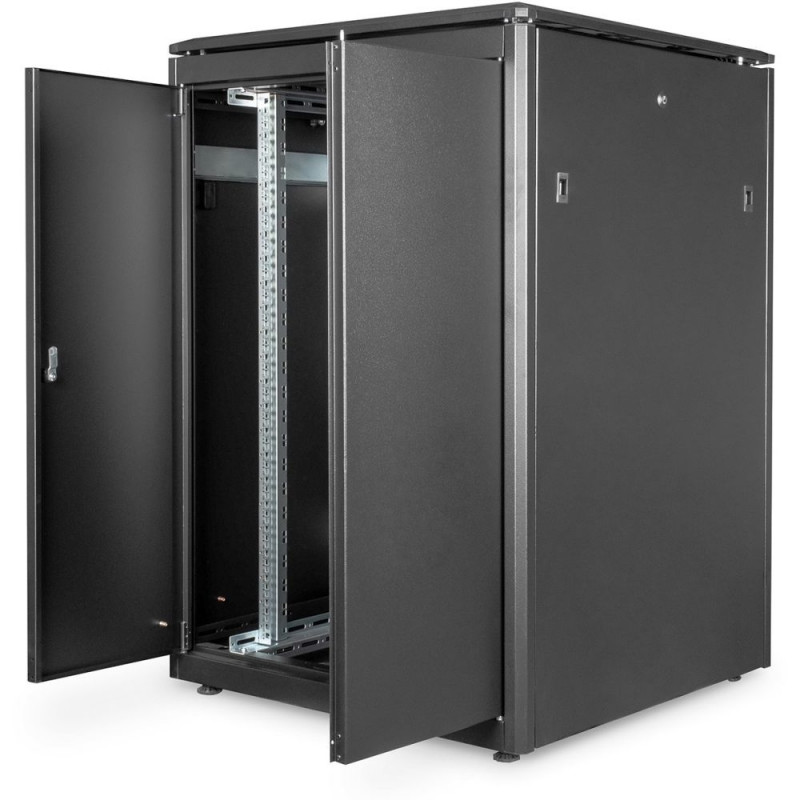 Kapi tugev teraskonstruktsioon tagab stabiilsuse ja pika kasutusea, samas kui must pulbervärvitud viimistlus annab sellele professionaalse ja esteetilise välimuse. Kapi esiosa on varustatud turvalise klaasist uksega, mis võimaldab visuaalset kontrolli seadmete üle ilma ust avamata. Tagauks on perforeeritud, et parandada õhuvoolu ja aidata kaasa seadmete jahutamisele. Mõlemad küljepaneelid on eemaldatavad, mis teeb paigaldamise ja hoolduse eriti mugavaks.