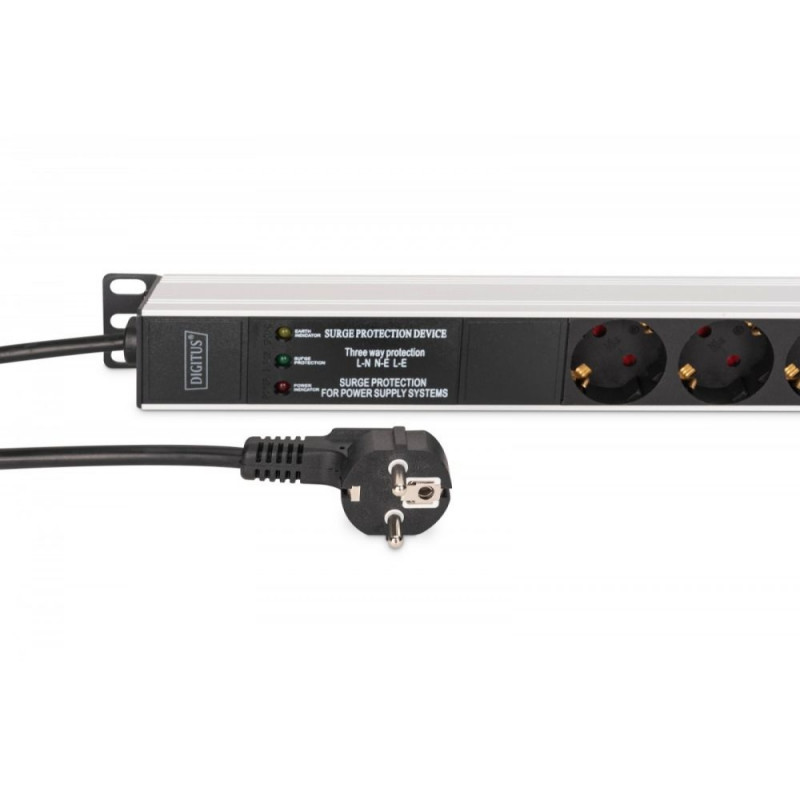 620 mm PDU riiuli toiteplokk ülepinge- ja EMI/RFI-filtriga, 9 Schuko CEE 7/3 pistikupesa (45°), 2 m kaabel Unischuko CEE 7/7 pistikuga, 16A, alumiinium