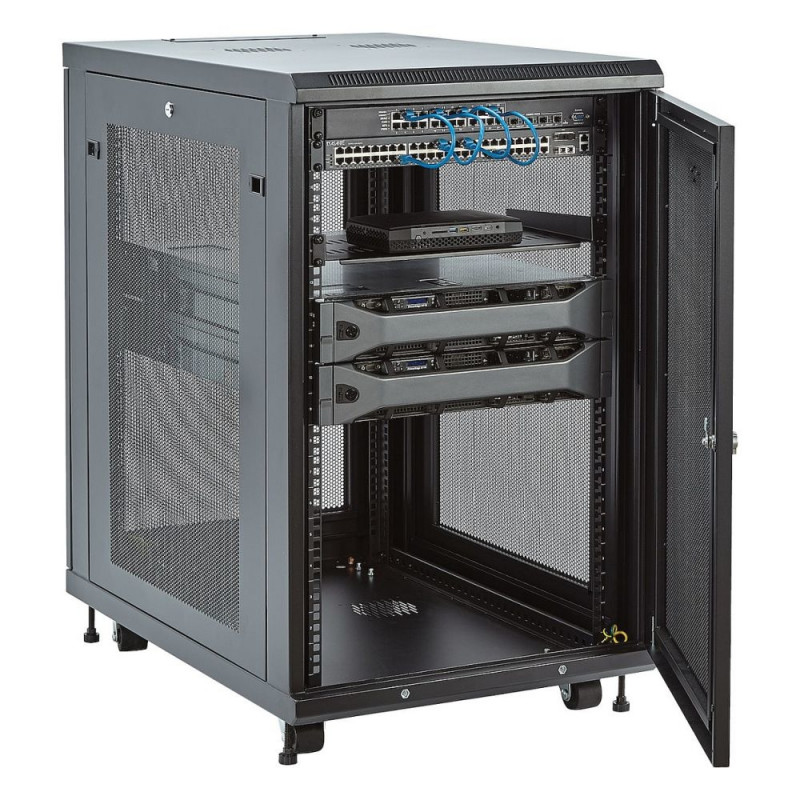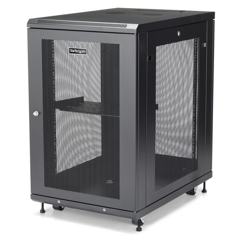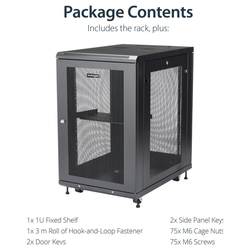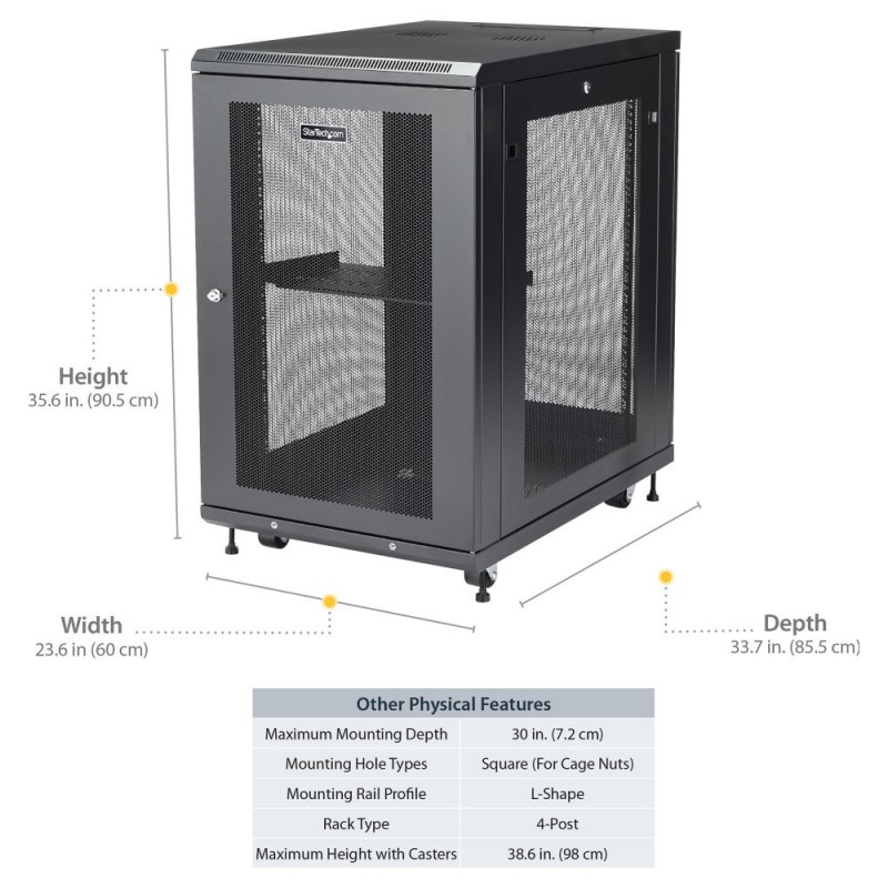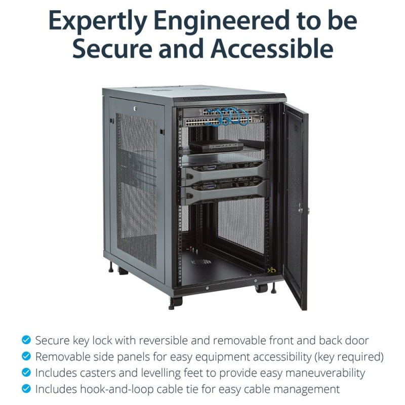 StarTech.com 18HE Enterprise serverikapi komplekt, 19-tolline 4-postiline serverikapp, koos riiuli ja kaablihaldusega, 75cm paigaldussügavus, 450kg kandevõime. Tüüp: Eraldiseisev raam, püstiku maht: 18U, maksimaalne kandevõime: 450 kg, turvalukk, täiustatud kaablihaldus, juhtrattad. Kaal: 59 kg. Toote värv: Must