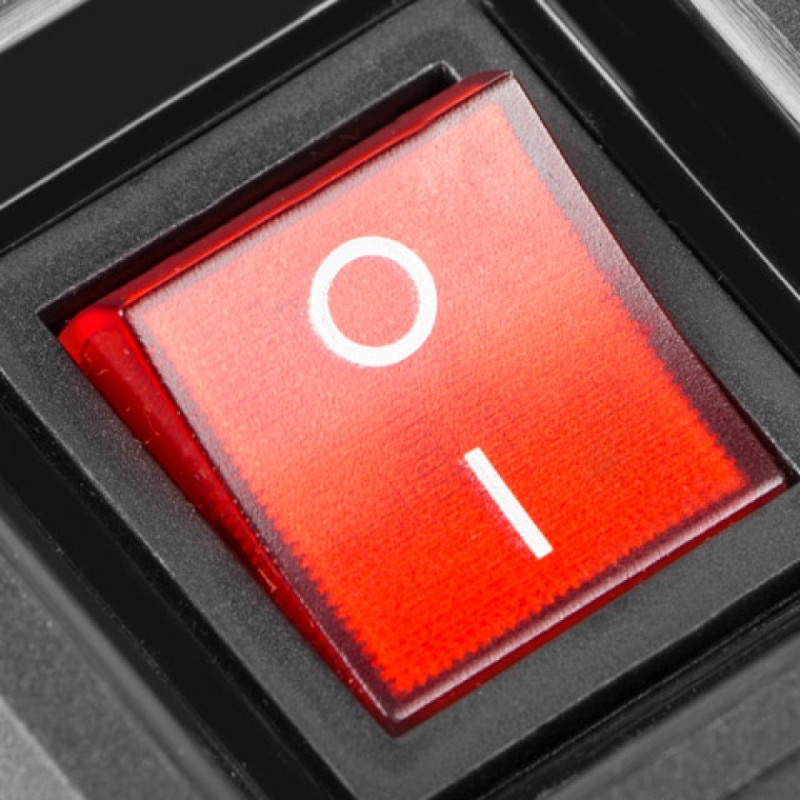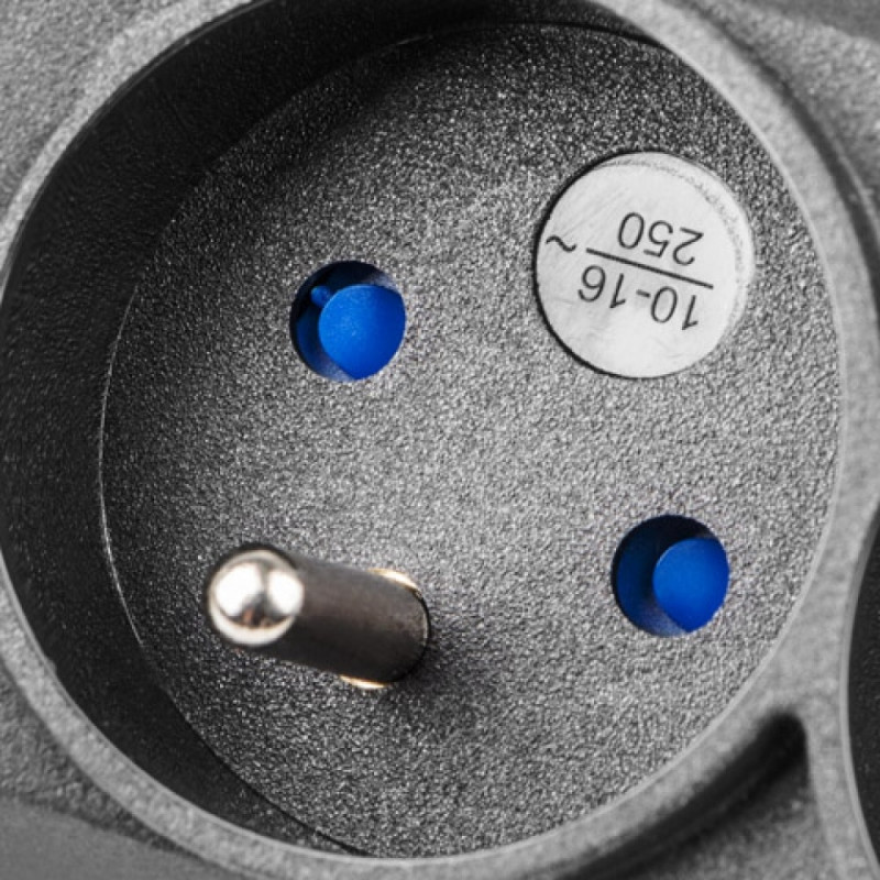 Multi M6 surge protector has 6 grounded sockets and a back-lit mains switch indicating the presence of voltage in the secure sockets.