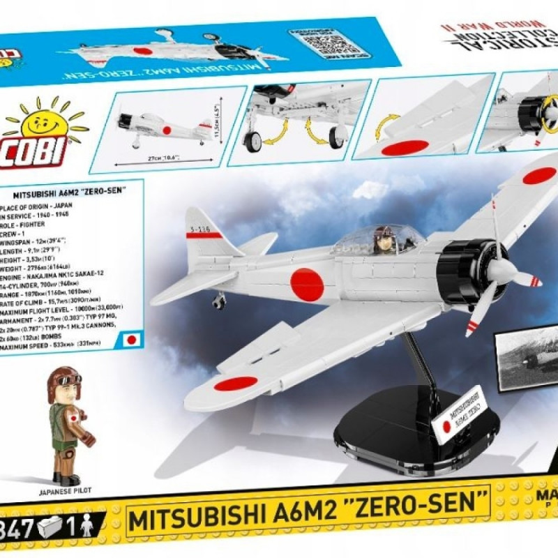 Teise maailmasõja hävituslennukite komplekteerimine on suurepärane viis aja veetmiseks ja kirgliku huvi rahuldamiseks ajaloo ja modelleerimise vastu. Mitsubishi A6M2 ehitusklotsikomplekt sisaldab 347 osa ja ühte piloodi figuuri. COBI hävitajalennuki mudel on loodud tähelepanu pöörates kõige pisematele detailidele. Lennukil on liikuv propeller ja roolipinnad. Sellel on kummist rehvidega pöörlevad rattad, mis saab väljaulatuva alusraami abil paigutada õhkutõusu või maandumisasendisse. Kabiini saab avada, et paigutada piloodi figuur juhtimisse, millel on täpselt taasesitatud vormiriietus ja trükk seljal! Lennuk on kaetud kvaliteetsete trükistega, mis ei kulu isegi intensiivse kasutamise korral. Komplektis on ka spetsiaalne alus mudeli atraktiivsemaks esitlemiseks ja plaat lennuki nimega. Jaapani hävitaja klotsimudel rõõmustab kindlasti nii noori lennundusfänne kui ka vanemaid lennundusajaloo entusiaste ja kollektsionääre.