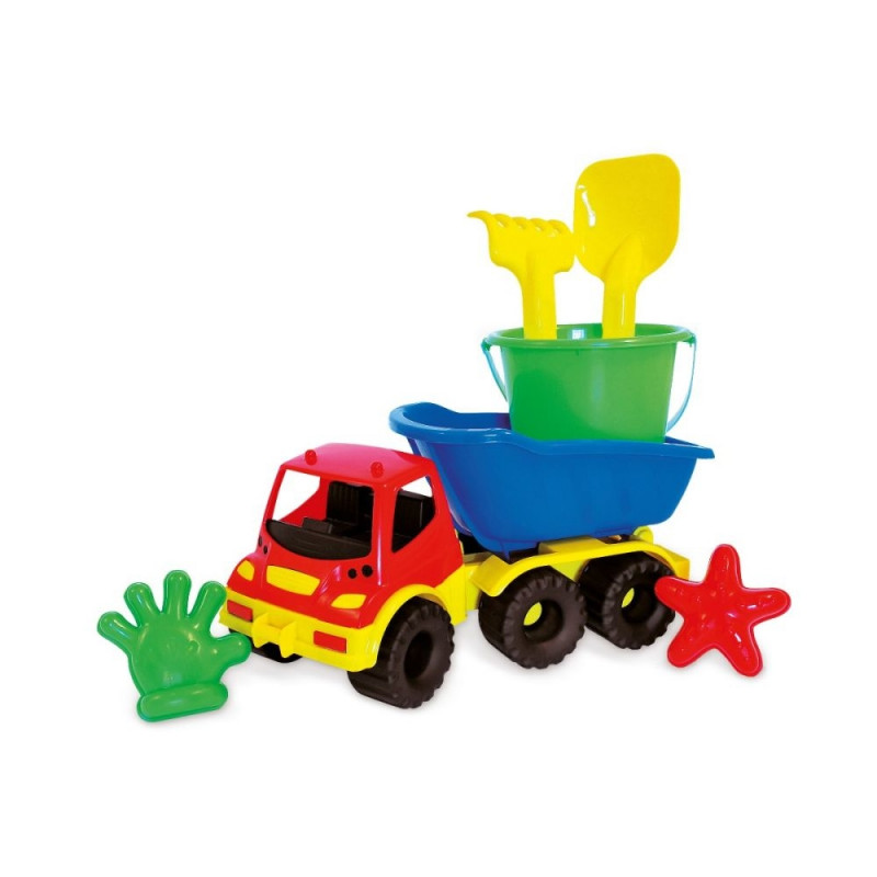 Komplektis on värviline veoauto koos ämbri ja kolme tarvikuga - labidas, reha ja 2 liivavorm. Kallur on valmistatud tugevast kvaliteetsest plastikust.