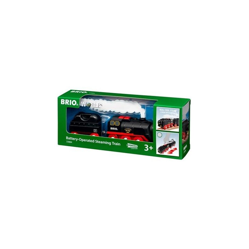 “Full steam ahead!”. Chug around your BRIO World railway with realistic steam effects in the 33884 Battery-Operated Steaming Train.Realistic steam effects: This battery-powered engine produces safe-to-touch steam from its chimney as it speeds down the tracks. Once you’re out of water, you can easily refill the engine using the refill load that’s being pulled behind the train. Lift out the black refill load from the cargo wagon and carefully fill it with water, inject the water into the engine via the filling chimney at the front and then you’re ready to go again.Battery-powered: Active the lights and movement by either pressing the red forward or backward button on the top of the engine. The steam will automatically come out of the chimney when the train is moving. Press either of the buttons again and the train will come to a halt, turning off the steam effects and light.Part of BRIO World: The Battery-Operated Steaming Train is a great addition to any BRIO World railway set or layout, featuring classic BRIO magnetic coupling for easy connection to other vehicles.