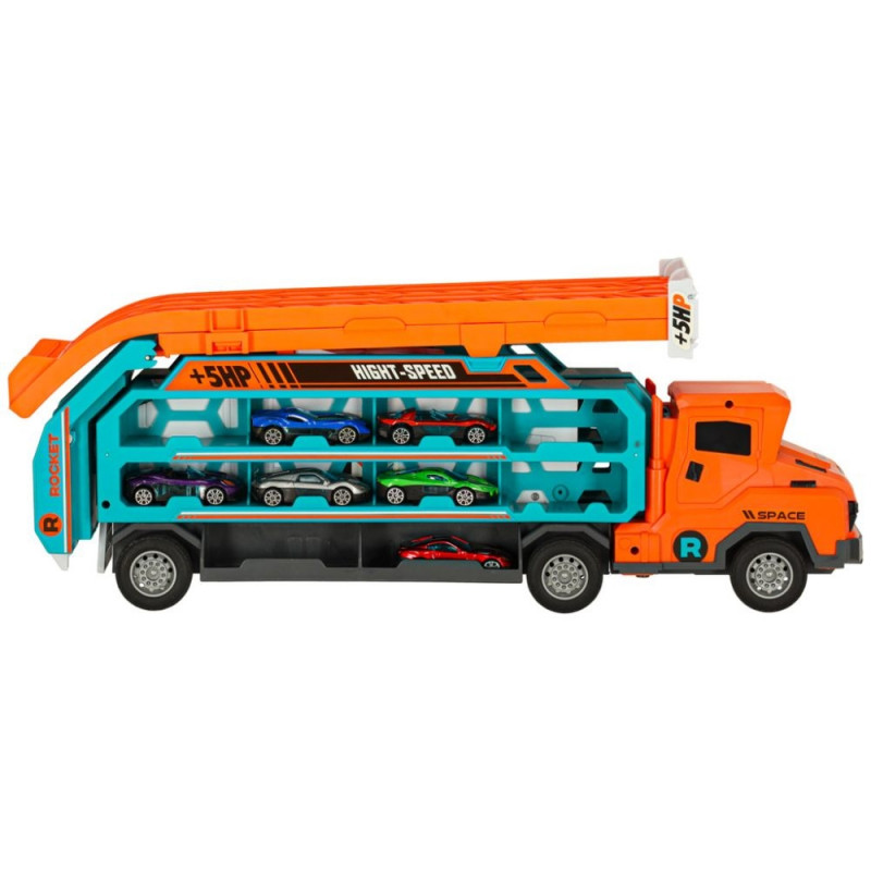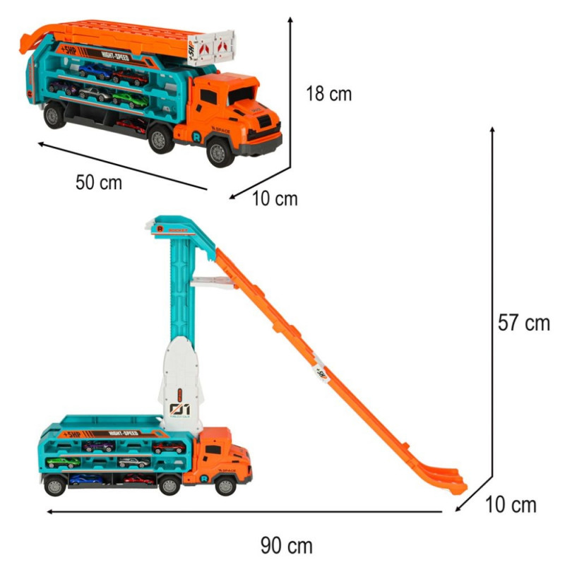 Haagise kujul saab mänguasja vedada kuus väikest autot, mis on paigutatud platvormidele, mistõttu on teie lapsel lihtne autosid ühest kohast teise transportida. Ja kui teie väike laps tahab dünaamilisemat mängu, saab haagise muuta muljetavaldavaks võidusõidurajaks, kus autod sõidavad kahel paralleelsel rajal.