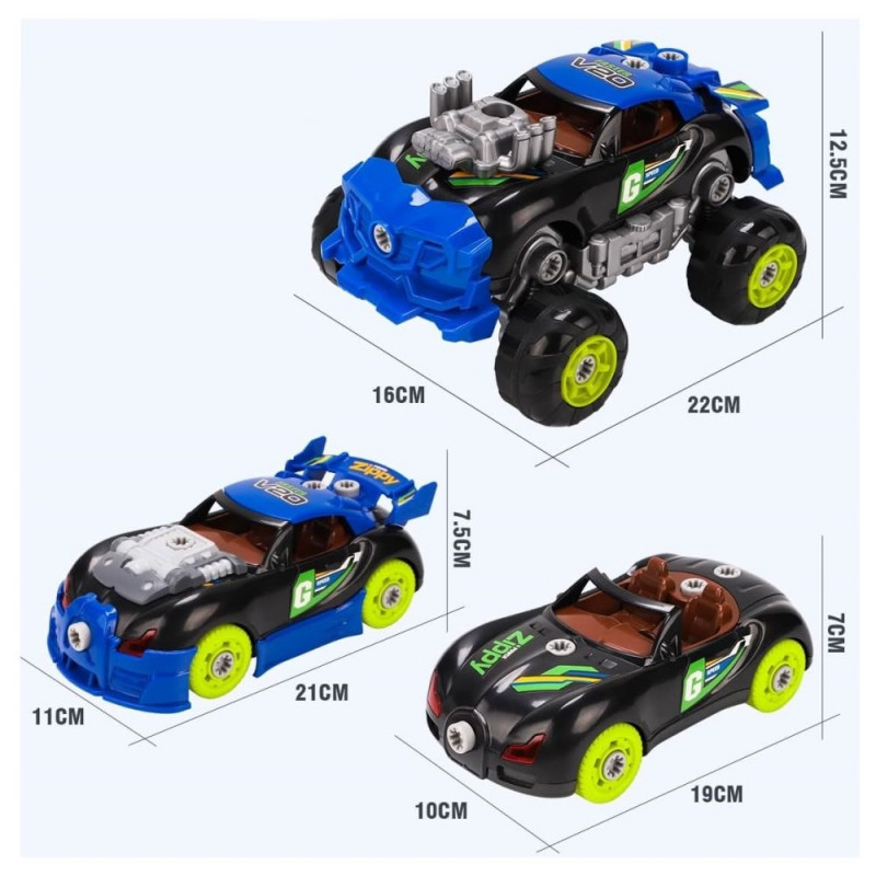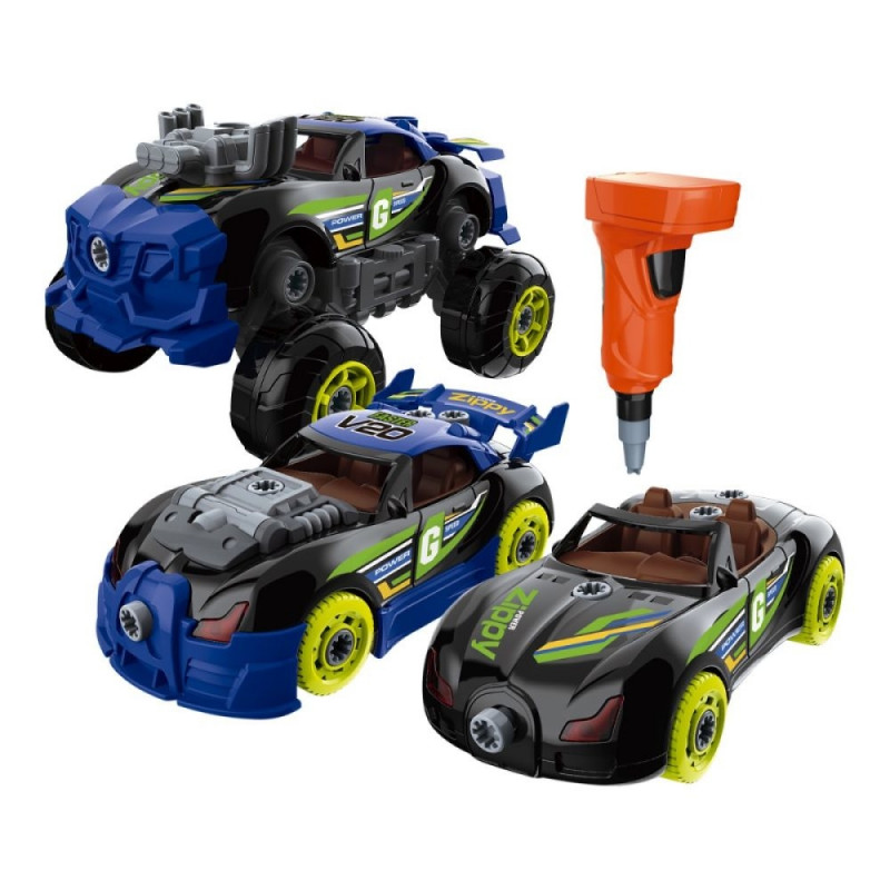 Komplekti kuuluvad kõik vajalikud osad autode ehitamiseks, pöörleva otsaga elektriline kruvikeeraja, millega saab kruvisid sisse keerata ja eemaldada.