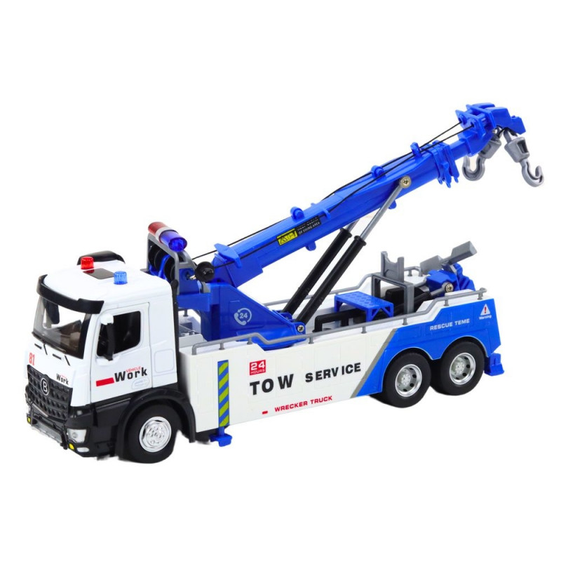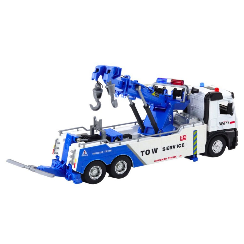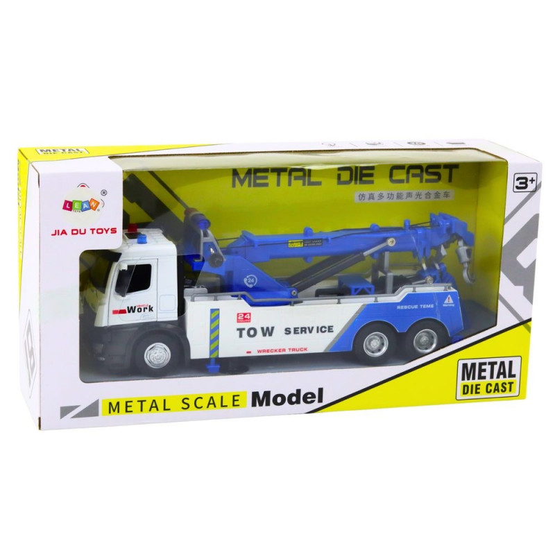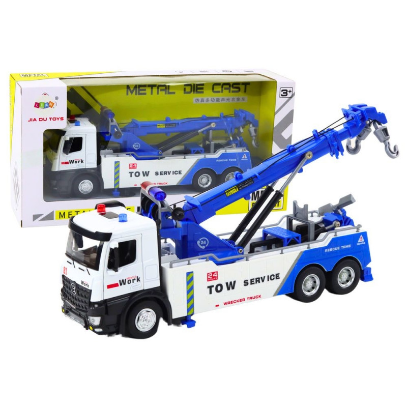 Metallist kraanaauto kahe konksuga, valge-sinine, valgus- ja heliefektidega