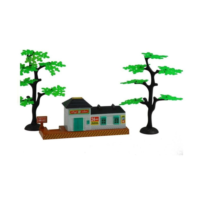 - vedur: 18 cm x 4,5 cm x 6,5 cm,- kaubavagun: 10 cm x 4,5 cm x 5,5 cm,- väiksemad vagunid: 23,5 cm x 4,5 cm x 6 cm,- raudteejaama hoone: 5,5 cm x 16,5 cm x 7,2 cm,- rööbastee: 78 cm x 3 cm x 156 cm.