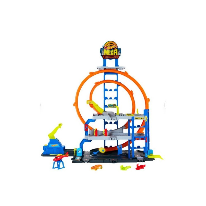 Hot Wheels City Mega Garaž Gigasilmus komplekt pakub kolme taseme jagu mängurõõmu, sütitades noorte võidusõitjate kujutlusvõimet, et nad saaksid välja mõelda loomingulisi lugusid ja sooritada vingeid kaskadööritrikke. Selle mitmetasandilise komplekti alumisel korrusel saab autoga sõita autopesulasse, kus on liikuvast vahtrullist ja kardinast koosnev pesusüsteem. Seejärel saavad lapsed laadida auto stardiplatvormile, kust see kihutab läbi gigasilmuse ning pöörang suunab selle erinevatele tasanditele. Samuti saab sõidukeid tõsta ükskõik millisele garaažitasandile, kasutades käsitsi juhitavat lifti või helikopterit. Võidusõidumaailma laiendamiseks tuleb lihtsalt kasutada Speed Snap Kiirklikk ühendusosi. Komplektis on üks metallist Hot Wheels mänguauto ja üks plastist mänguhelikopter. Lisautod ja -rajad on müügil eraldi. Värvid ja dekoratiivsed elemendid võivad erineda.