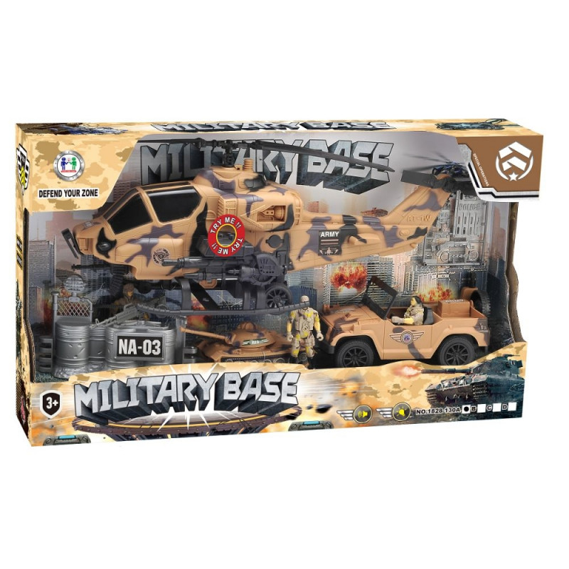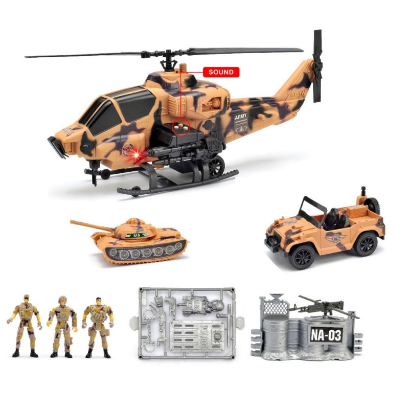 Saa osa põnevatest lahinguseiklustest selle detailirohke sõjaväe mängukomplektiga! Komplektis on realistlike mõõtmetega helikopter heliefektidega, tank, sõjaväeauto ning kolm sõdurifiguuri koos varustusega. Ideaalne komplekt väikestele strateegiamängude austajatele.