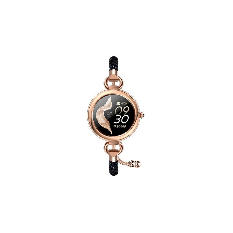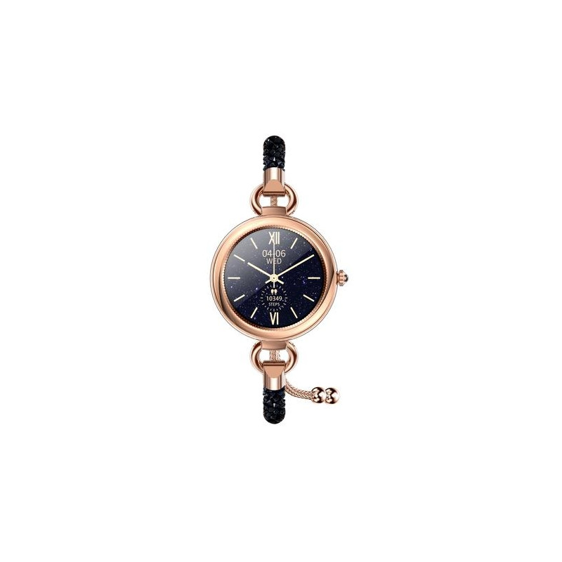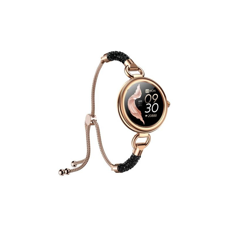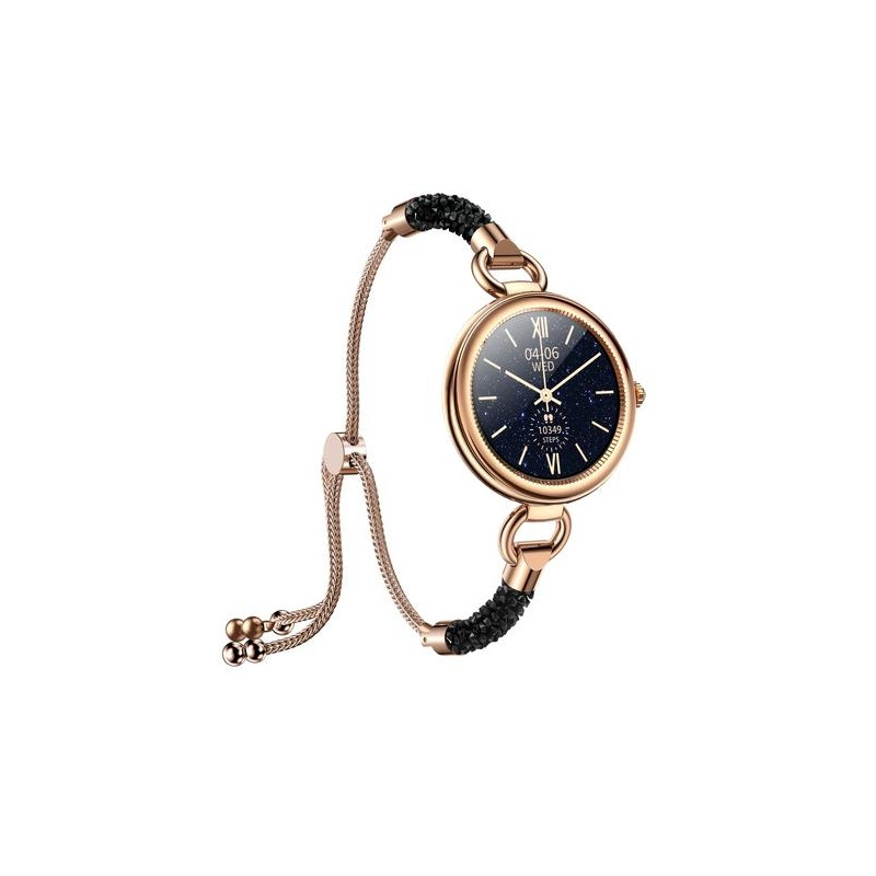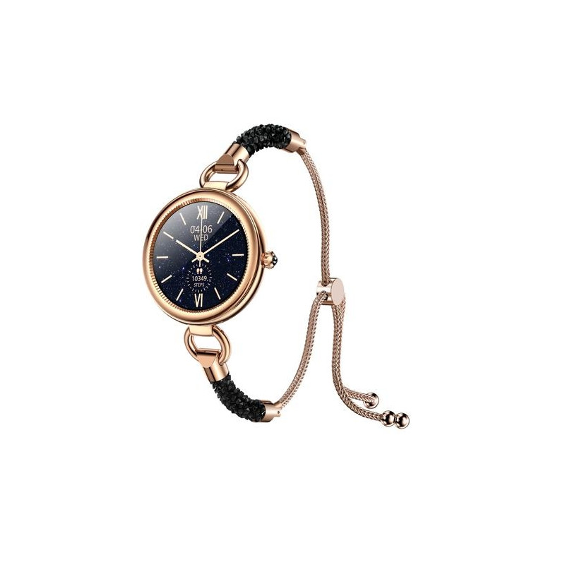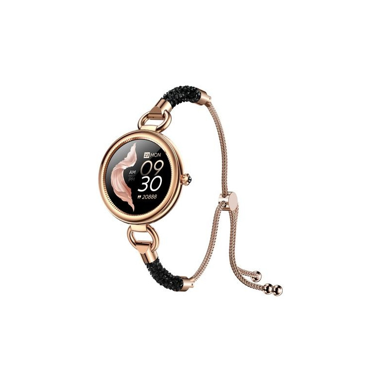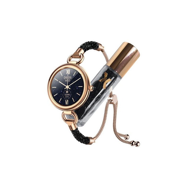A feminine smartwatch that looks beautiful on the hand, enriching the styling like your favorite jewelry. The model measures a number of health parameters, including female functions, has an infinite number of dials, displays notifications, and the battery life is up to 7 days. In addition, a container for oil or liquid<br>highlighter with a ball, crystal finish. The inside of the bottle, filled with natural crystals, enriches the cosmetic with the valuable properties of black obsidian. Everything to bring out the natural glow and beauty!MaxCom FW51. Display diagonal: 2.77 cm (1.09"), Display resolution: 240 x 240 pixels. Battery capacity: 130 mAh. Band colour: Black, Gold, Band size: One Size