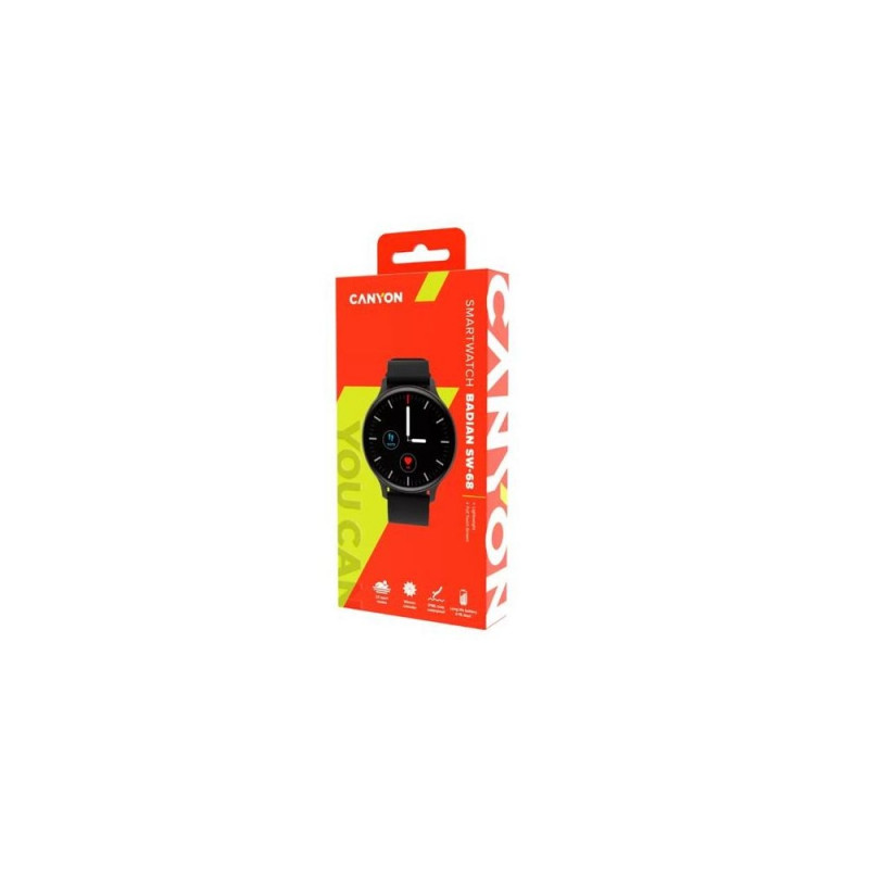 <b> Badian Smartwatch SW-68</b><br><br>This watch is a rare combo for sporty people! Look, we have 22 sports modes, from regular walks to baseball and yoga. Statistically speaking, there is a high chance that your favorite activity will be among the included modes. If you are an avid swimmer, our watch is protected by the IP68 standard. It will monitor your heart rate, your sleep, and remind you to drink water. To keep you comfy, we used hypoallergenic silicone for the strap. The watch is highly customizable and allows you to receive notifications and control media playback. All that without the nuisance of charging it every night — our SW-68 model lasts up to 6 days in active mode. Please note that we care about your privacy — the Canyon smartwatch follows the GDPR standard and protects your personal data.<br>Canyon CNS-SW68BB. Display technology: LCD, Touchscreen. Band material: Silicone, Band colour: Black