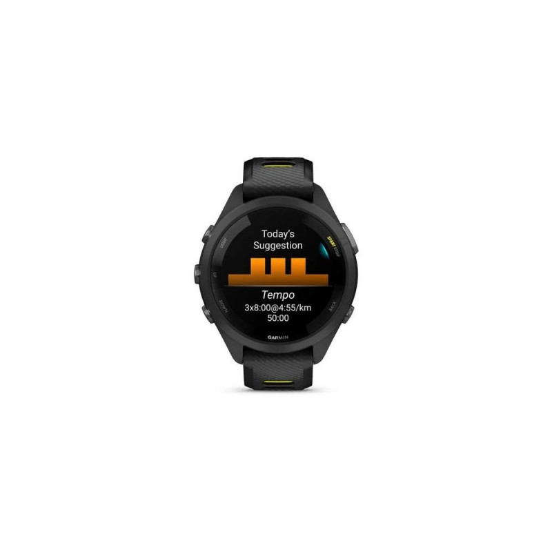 <b>TRAIN BRILLIANTLY WITH AN AMOLED DISPLAY</b><br>WHAT IF YOUR NEXT RACE WAS THE PERFORMANCE OF A LIFETIME? AND PERSONALIZED DAILY SUGGESTED WORKOUTS HELPED YOU DO SOMETHING YOU’VE NEVER DONE? WITH THE FORERUNNER 265S SMARTWATCH, YOU’LL SEE EVERY INSIGHT LIT UP ON A COLORFUL AMOLED TOUCHSCREEN DISPLAY. GET READY TO BE BETTER FOR IT.<br><br><b>KNOW WHERE YOU STAND WITH MORNING REPORT</b><br><br><b>RUN. RECOVER. REPEAT.</b><br>WITH UP TO 15 DAYS OF BATTERY LIFE IN SMARTWATCH MODE<br><br><b>COMES IN TWO SIZES TO FIT EVERY WRIST</b><br><br><b>PLAN YOUR STRATEGY</b><br>WITH RACE WIDGET, PERSONALIZED DAILY SUGGESTED WORKOUTS, TRAINING READINESS SCORE AND MORE<br><br><b>MORNING REPORT</b><br>Receive an overview of your sleep and training outlook as soon as you wake up — alongside HRV status and weather. You can even customize your report to show you what you want to see.<br><br><b>RACE WIDGET</b><br>Get ready for your next race — whether it’s a 10K or marathon — with training tips, personalized daily suggested workouts and completion time predictions based on course details, weather and performance.<br><br><b>DAILY SUGGESTED WORKOUTS</b><br>Get workouts made for you. They adapt after every run to match your performance and recovery and take into account the races coming up in your Garmin Connect™ calendar.<br><br><b>TRAINING READINESS</b><br>From the moment you wake up, get a readiness score based on your sleep quality, recovery, training load and more, so you can determine whether it’s a good day to go hard — or take it easy.<br><br><b>TRAINING STATUS</b><br>Using indicators such as HRV status, your recent exercise history and performance, get an easy insight into your overall effort — and whether you’re training productively, peaking or strained.<br><br><b>HRV STATUS</b><br>Gain a deeper understanding of your overall health, training and recovery through heart rate variability while you sleep, based on technology developed by our Firstbeat Analytics™ team.Garmin Forerunner 265S. Display diagonal: 2.79 cm (1.1"), Display technology: AMOLED, Display resolution: 360 x 360 pixels, Touchscreen. Flash memory: 8 GB. Wi-Fi. GPS (satellite). Weight: 39 g. Band material: Silicone, Band colour: Black, Yellow, Band size: One Size