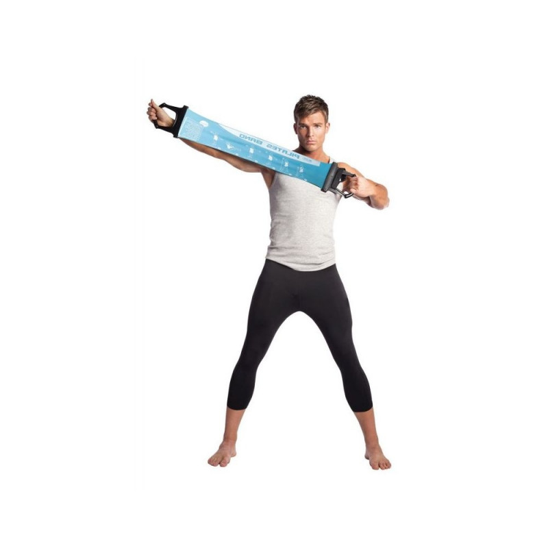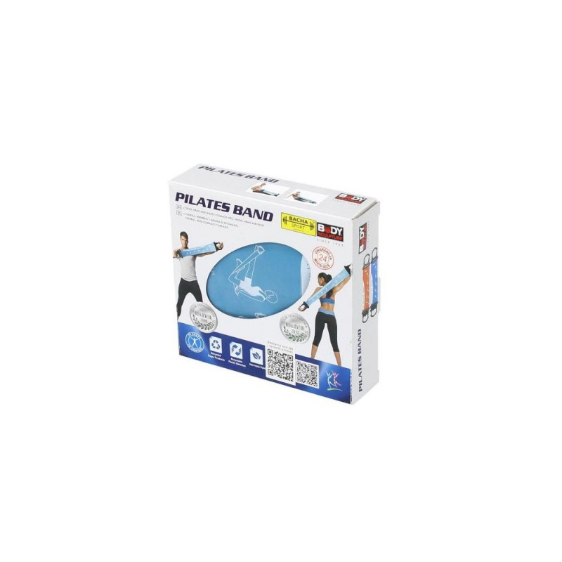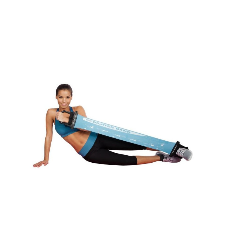 The Pilates band with handles allows for comfortable and effective strength and coordination training. The blue latex band is printed with sample exercises to shape and tone various parts of the body.