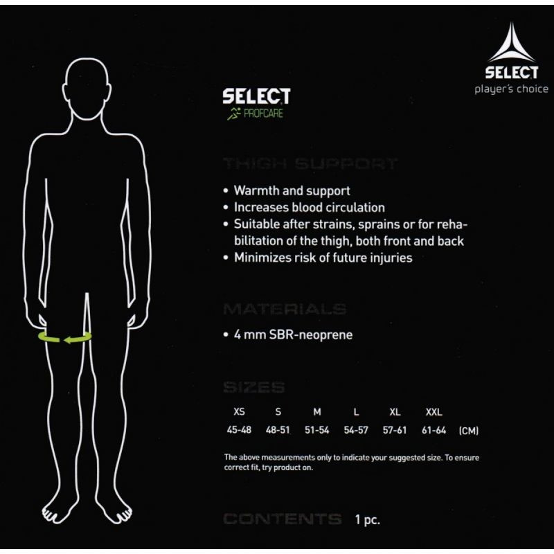 Select Thigh Protector Thigh protector made of 4mm SBR neoprene. Provides warmth, protection, and increased blood flow. Suitable for strains and rehabilitation of both the anterior and posterior thigh muscles. Minimizes the risk of injury. ApplicatioOsta kohe, viimased eksemplarid laos!