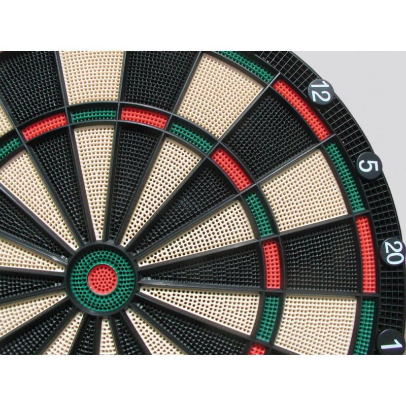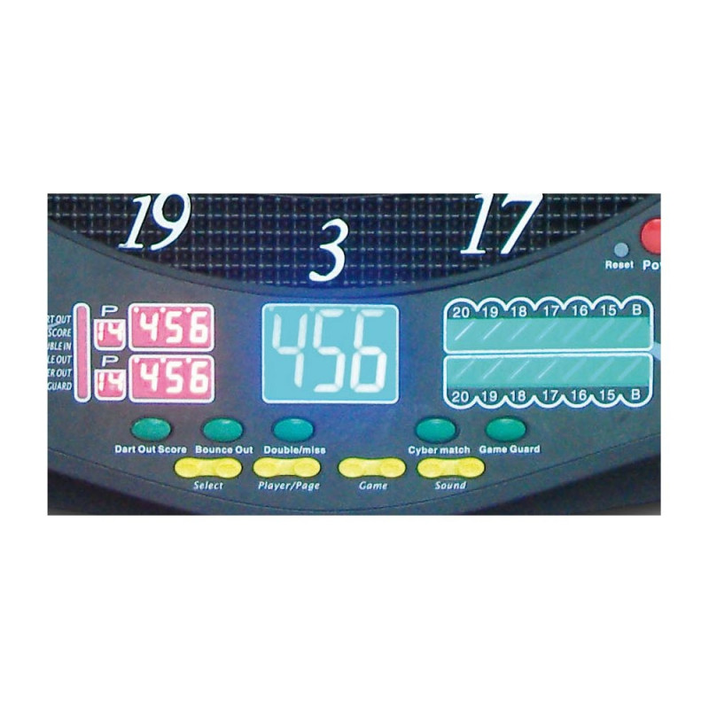 Electronic dartboard, designed for both beginners and advanced players. 1 to 16 players. Adapter operated from 220V AC to 5V DC included. 8 backlight LCD display. Red light shows 2 players at a time, active function and total scores. Blue light shows the score of each dart thrown. Green light shows cricket scoring. 28 games with 131 games variations. Voice and sound effects. Sound volume control – adjustable up to 0-8 levels. Vocal instructions (English). SLEEP function: the dartboard will automatically suspend if no action occurs within approximately three minutes. This is designed to save power or battery life. All scores will be stored in memory and play will resume when any button is pressed. Double function: activates the Double In/Double Out and Master Out options for the 301, 401, 501... games. Miss function: allows registering a “missed” dart. Bounce out function: allows counting darts that do not remain in board. Patent "Game Guard" feature: pressing the button all of the key