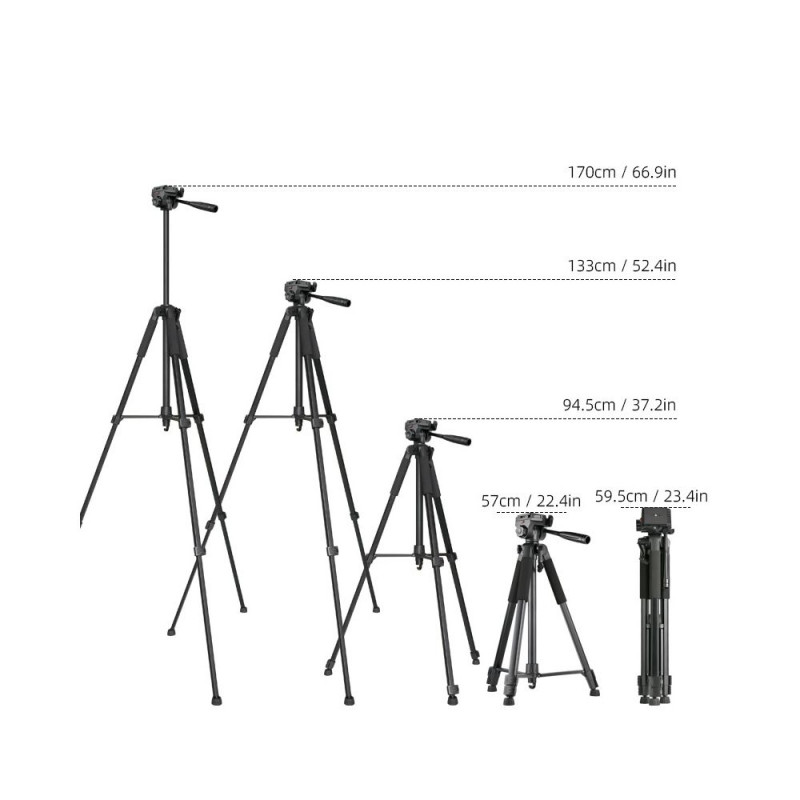- Saad kaamera kõrgust kohandada iga pildistamisülesande jaoks. Statiivi kõrgust saab hõlpsasti reguleerida vahemikus 57 cm kuni 170 cm, mis teeb selle sobivaks erinevateks pildistamissituatsioonideks ja -stiilideks.