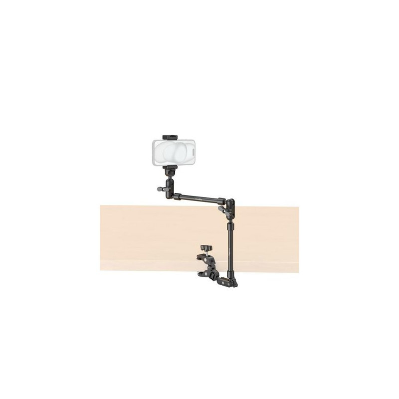 SmallRig Magic Arm with Crab Clamp Kit 4766 offers a comprehensive shooting solution for users working with lightweight devices such as smartphones, webcams, and action cameras. The kit includes a 56cm (22in) adjustable magic arm, a crab clamp, a phone holder, and a 1/4"-20 to 3/8"-16 thread adapter. The adjustable magic arm attaches to the crab clamp with an anti-deflection 1/4"-20 threaded screw, ensuring a secure link between the clamp and the arm. The crab clamp extends up to 50.0cm / 19.7in, adapting to various surfaces and objects within its range, while silicone pads at the swivel tips provide a secure grip without damaging the surfaces. The ball head on the magic arm features anti-skid rubber washers to increase friction, ensuring a tighter lock on the device. The phone clamp is designed to accommodate phones ranging from 7.0 to 10.0cm (2.7 to 3.9in) in width. The 1/4"-20 to 3/8"-16 thread adapter is compatible with microphones for live streaming, podcasting, and various audio recording scenarios. Constructed from durable aluminum alloy, the main body can effectively support up to 0.25kg / 8.8oz. We also recommend using SmallRig Crab-Shaped Clamp with Ballhead Magic Arm (ID 3757B) and SmallRig Portable Dual Suction Cup Camera Mount (ID SC-2K 3566) for shooting with lightweight devices.SmallRig 4766. Best uses: Action camera, Smartphone, Product colour: Black, Material: Aluminium. Width: 71 mm, Depth: 29 mm, Height: 649 mm. Package width: 90 mm, Package depth: 55 mm, Package height: 340 mm