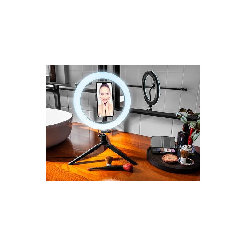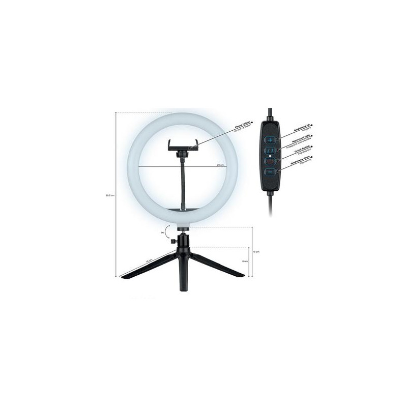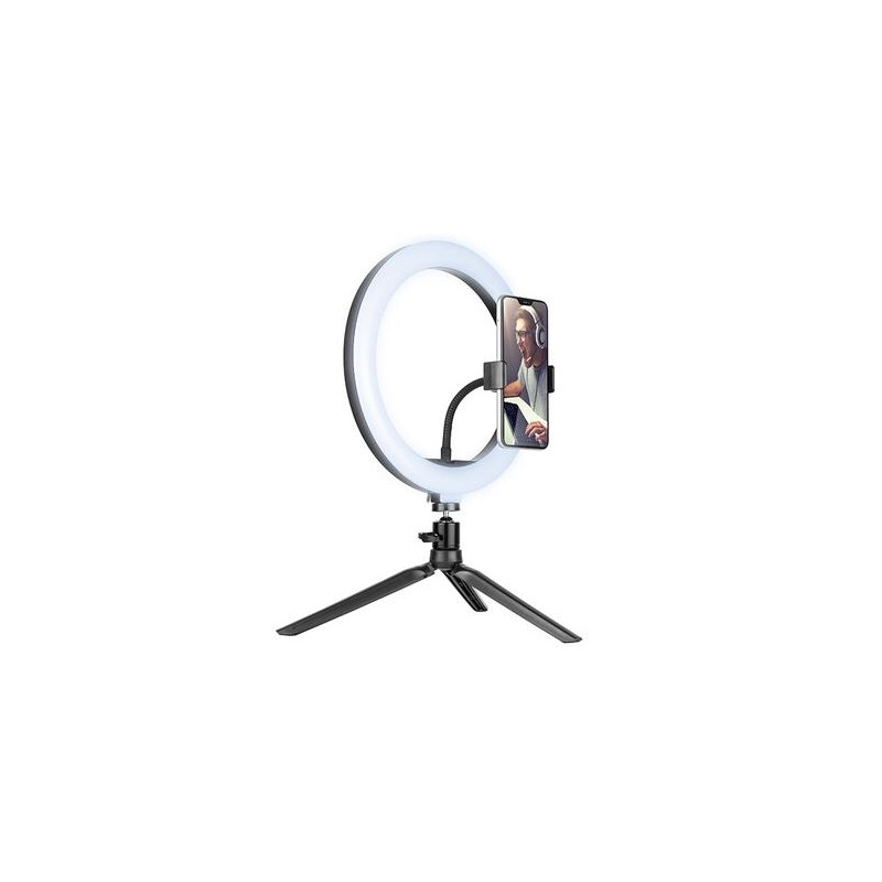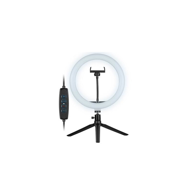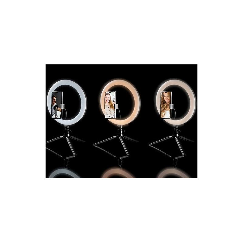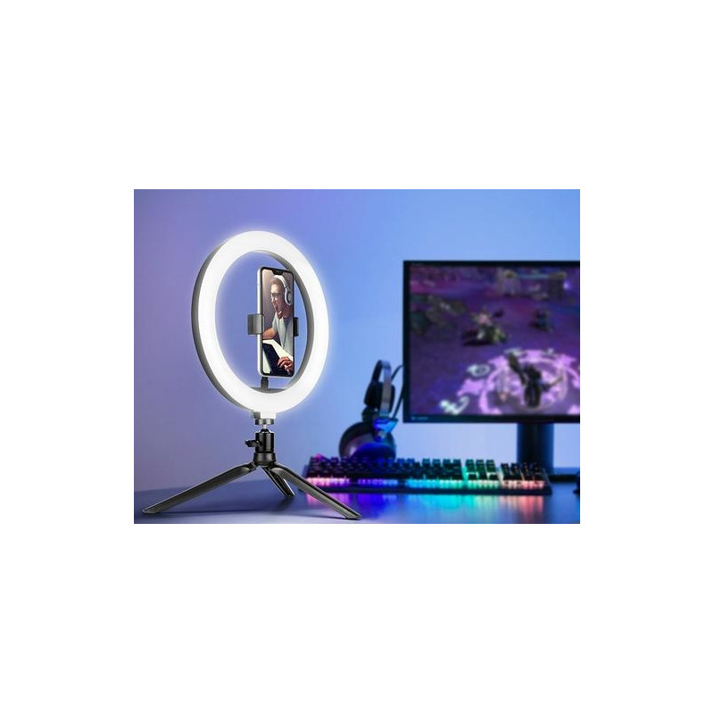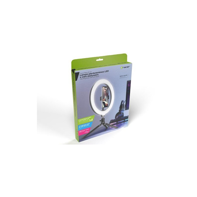 Even the best cameras or video recorders cannot provide high quality image if the object is not properly illuminated. Whether you're streaming on Twitch, recording videos on Tik Tok, or running an Instagram account, the Tracer RING USB ring light will bring a new quality to your creations!<br><br><b>An indispensable piece of equipment for gaming streamers</b><br>Streaming games, usually in the evening hours, requires intense, but properly diffused lighting so that the image from the camera is not overexposed and does not create undesirable shadows on the face. The biggest streamers on Twitch already know it, replacing the previously used lighting with ring lamps, connected directly to their PCs!<br><br><b>Tik Tok and Instagram creators’ must-have piece of equipment</b><br>Ring lights are used not only in the gaming world, but also in other areas of streaming! Compact design, perfect lighting conditions and the ability to adjust the colour temperature will also be appreciated by content creators on platforms such as Tik Tok or Instagram.<br><br><b>A PC accessory essential for video conferences and e-school!</b><br>Built-in or accessory PC cameras, even those with LEDs lighting, do not illuminate the user sufficiently to ensure high image quality. They convey a dark and grainy image in low light conditions. In the era of more and more common online communication, video quality is becoming increasingly important – a ring light connected to the USB port is the perfect complement to your video conference station!<br><br><b>10” lamp | 120 LEDs</b><br>Our 10” ring lamp has an inner diameter of 20 cm (26 cm outer) and 120 LEDs, evenly distributed in the housing of the lamp. The lamp has light intensity adjustment in the range of 900-1700 lm and colour temperature adjustment (3 modes) in the range of 2700 to 7000 K.<br><br>It features a telephone holder mount included in the set, which allows you to place your smartphone in the centre of the ring.<br><br><b>Illuminated remote control on the USB cable</b><br>The lamp has a dedicated remote control on the USB power cable, allowing you to turn the lamp on and off, change light intensity and colour temperature. In order to facilitate the management of lamp parameters in difficult lighting conditions, the buttons on the remote control are backlit. The length of the power cable is 175 cm.<br><br><b>Table top tripod with adjustable head</b><br>Our desktop set includes a tripod with 19 cm arms which, when fully open, reaches a height of 9 cm from the surface. The tripod has rubber feet to prevent the set from slipping and sliding. Wide spacing of the arms guarantees exceptional stability of the entire set.<br><br>Along with the tripod, the user gets a dedicated swivel mounting head that connects the tripod to the light ring. It allows you to adjust the inclination of the ring in relation to the tripod, in each direction.<br><br>The lamp requires a 5V DC power supply with a minimum intensity of 500mA (can be connected to a computer USB port). However the full declared power is achieved when connected to a 5V / 3A power supply.Tracer TRAOSW46747. Bulb technology: LED, Material: Acrylonitrile butadiene styrene (ABS), Aluminium, Metal, Luminous flux: 1300 lm. Power source type: DC, Power: 10 W, Input voltage: 5 V. Diameter: 2.6 cm, Inner diameter: 2 cm, Outer diameter: 2.6 cm. Folded length: 9 cm, Tripod length (max): 35 cm, Cables included: USB