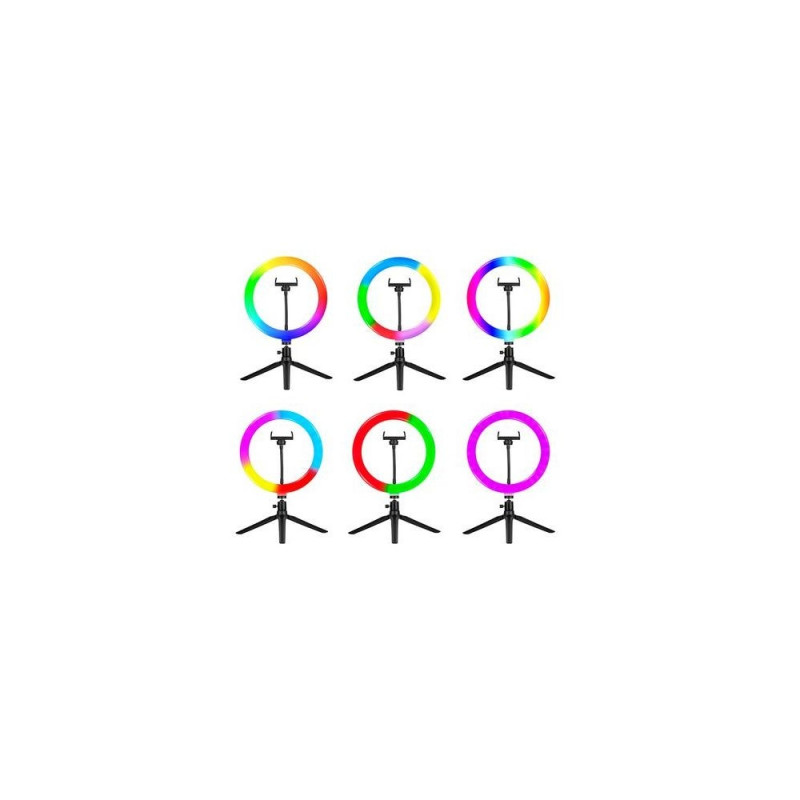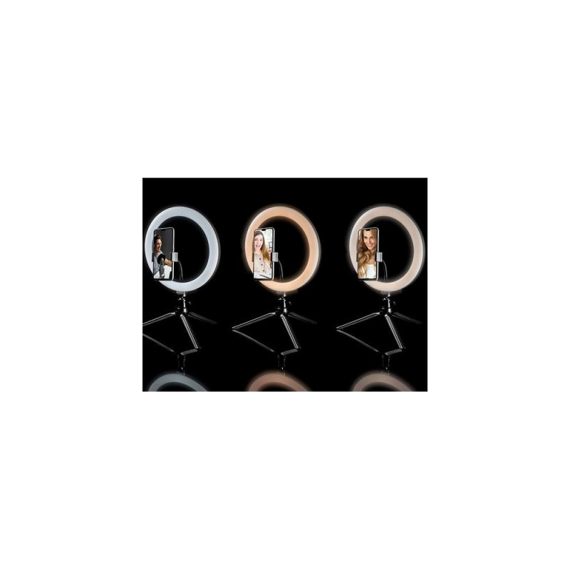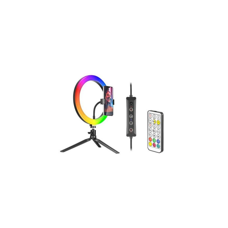 <b>TRACER Ring RGB ring light with stand</b><br>The LED ring light is a unique type of steady light that allows you to evenly illuminate the photographed object. The ring light with modern LEDs accurately reproduces colors and imitates daylight, which makes it perfect for taking portrait photos and shooting vlogs. The Tracer ring light will ensure perfect lighting, no matter what it is used for - it will help you prepare sophisticated makeup as well as take a cute selfie.<br><br><b>High performance LEDs</b><br>The Tracer ring light is an incredibly compact device. Equipped with LED diodes which ensure better light and greater durability than traditional light sources. LED diodes are also very energy-efficient, which is very important if you plan to use the lamps every day, for many hours at a time. The device allows you to adjust the brightness level, which makes the lighting power fully adaptable to your needs.<br><br><b>Perfect for work</b><br>The Tracer light is equipped with LEDs with a color temperature from 2800 to 7000 K, allowing you to obtain the light temperature similar to the temperature of daylight. This lighting is perfect for any kind of activity: work or studying; it is also great if you need natural color reproduction. So if you're planning a photoshoot, preparing professional makeup, and want to get a well-lit effect with a realistic color palette, choose the Tracer ring light.<br><br><b>Remote control</b><br>The lamp comes with a wireless remote control. In addition to switching on and off, brightening and dimming, it also allows you to precisely select one of 18 colors and to operate the lamp from a distance.Tracer TRAOSW46807. Bulb technology: LED, Luminous flux: 1700 lm, Colour temperature (min): 2800 K. Power source type: DC, Power: 7.5 W, Input voltage: 5 V. Diameter: 26 cm, Height: 90 mm, Weight: 380 g