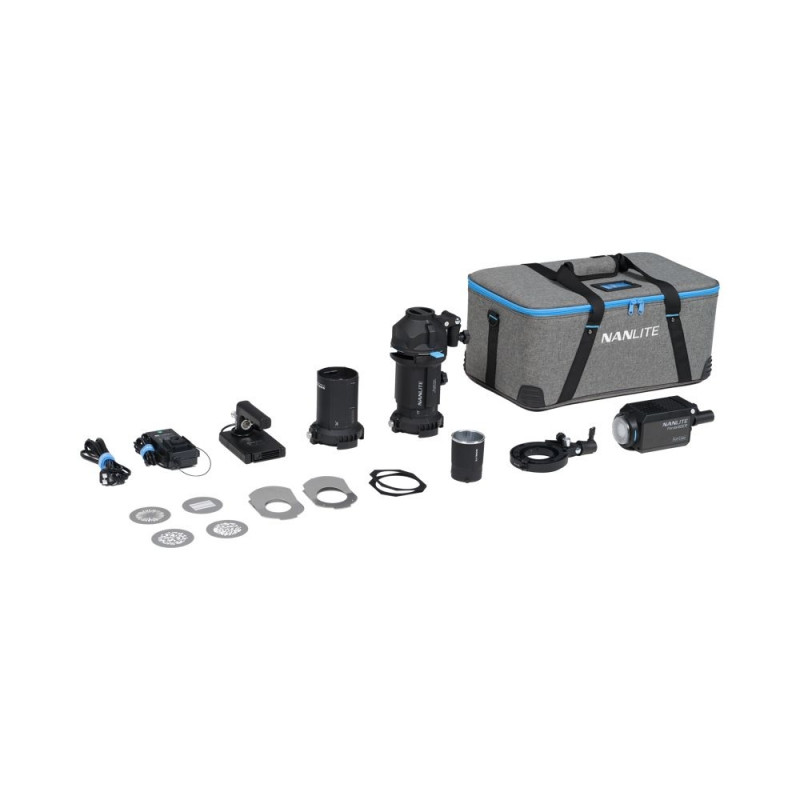 Nanlite Forza 60CR RGBLAC LED Spotlight with built-in CRMX wireless DMX, and the PJ-FMM Projection Attachment. It also includes 19° and 36° interchangeable lenses, 4 gobos, 2 gobo frames, a mini reflector, a Bowens-Mount adapter, and a padded carrying case that safely holds it all.Osta kohe, viimased eksemplarid laos!