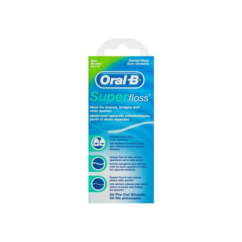Oral-B Super Floss dental floss gently and safely removes plaque from the gum groove. The end of the thread is reinforced for easy insertion. Suitable for cleaning fixed braces and dental bridges.