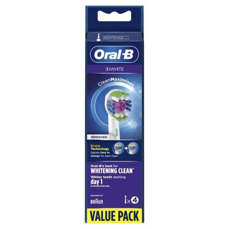 As one of Oral-B’s premium replacement toothbrush heads, the 3D White features an exclusive polishing cup that whitens teeth starting from day 1 by removing surface stains. Oral-B’s improved 3D White toothbrush heads are developed with CleanMaximiser technology that turns green bristles yellow for optimal brush head performance and the best clean. The unique bristles brush away plaque for a more advanced clean than with a regular manual toothbrush. Compatible with all Oral-B handles except Oral-B iO.<br><br><b>A WHITER SMILE</b><br>Inspired by professional dental tools, the 3DWhite toothbrush head is designed to clean tooth-by-tooth and is ideal for advanced cleaning and whitening. The specialized bristles sweep away plaque and the polishing cup whitens teeth starting from day 1 by removing surface stains.<br><br><b>POLISHING CUP WHITENS TEETH</b><br>The 3DWhite replacement toothbrush head is designed for advanced cleaning to help you achieve a whiter smile. With a special polishing cup that gently removes surface stains, this replacement toothbrush head will give you the power to whiten your smile starting from day 1.<br><br><b>REPLACE BRUSH HEADS EVERY 3 MONTHS*</b><br>Dentists recommend replacing your toothbrush every 3-4 months. Oral-B replacement toothbrush heads feature Indicator bristles that fade halfway to help remind you when to replace your toothbrush head so you maintain a superior clean.<br><br>*vs. a regular manual toothbrush.Oral-B 3D White Replacement Brush Head with CleanMaximiser Technology, 4 pcs. Number of brush heads included: 4 pc(s), Product colour: White, Cleansing brush replacement(s) period: 3 month(s). Weight: 21.8 g. Package width: 18 mm, Package depth: 60 mm, Package height: 220 mm. Quantity per pack: 4 pc(s), Master (outer) case width: 126 mm, Master (outer) case length: 149 mm. Inner package quantity: 6 pc(s)