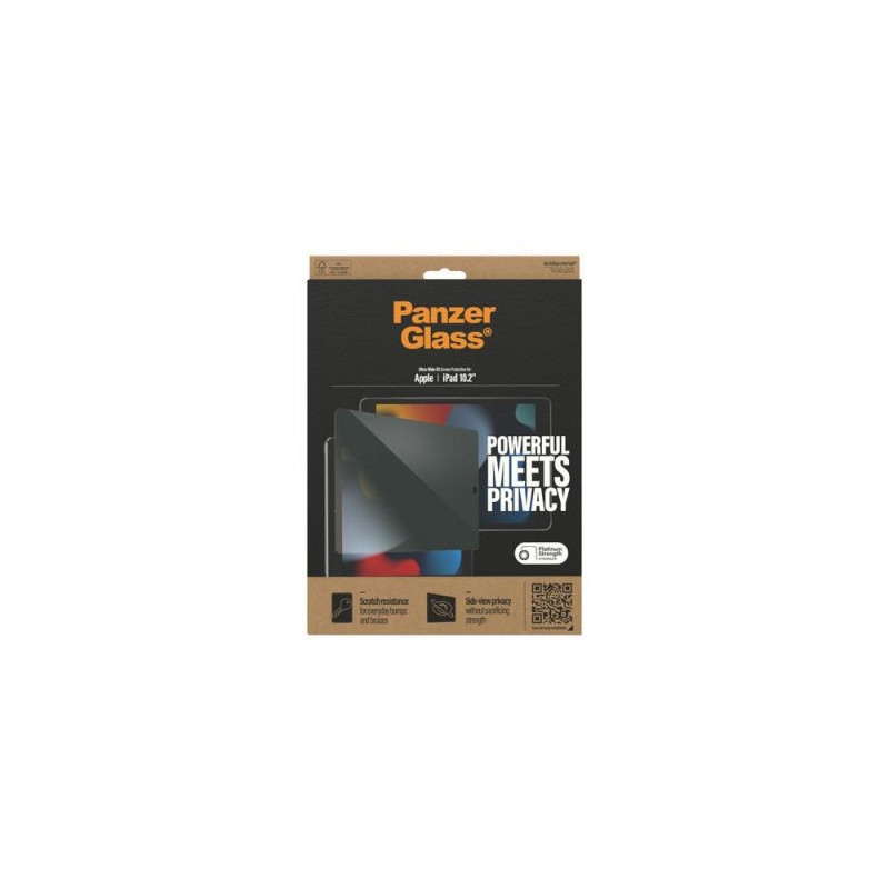 Private messages. Bank details. Pin codes. With this screen protector, your secrets are safe from the prying eyes of people sitting next to you on the train, on the bus or in the office. The specially designed privacy filter renders the content of your screen virtually invisible to everyone except you. Protect your iPad from the hazards of everyday life with PanzerGlass®. Accidental bumps against sharp-edged table corners or crushing falls onto stone-hard floors are no match for this scratch and shock-resistant screen protector. It even has a smudge-free coating with antibacterial effect that reduces traces of fingerprints and kills up to 99.99% of all common surface bacteria. The screen protector is easy to apply and once installed, you’ll never again fear the sight of your iPad tumbling to the ground. This may never happen, but if it does, you’ll regret not having clicked “add to cart”.<br><br>The Edge-to-Edge screen protector covers the entire front surface of your iPad, while leaving room for a case.PanzerGlass ® Privacy Screen Protector iPad 10.2″ (2019, 2020-2021). Brand compatibility: Apple, Compatibility: Apple - iPad 10.2″. Dry application. Protection features: Scratch resistant, Shock resistant, Anti-bacterial. Privacy filtering function, Material: Tempered glass, Polyethylene terephthalate (PET), Silicone, Product colour: Transparent. Quantity per pack: 1 pc(s)