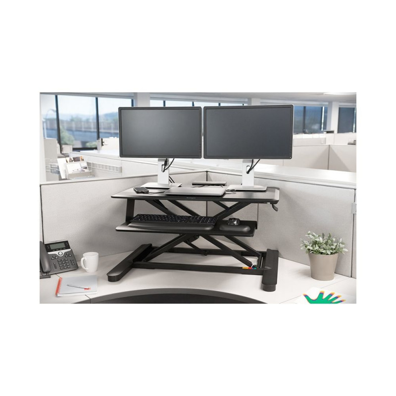 • Kvaliteetne kahetasandiline struktuur pakub 900mm laiust lisapinda, kus on piisavalt ruumi kahe monitori seadistamiseks, dokumentidele ja muudele töölaua tarvetele, sisseehitatud klaviatuuri- ja hiirealus ning ergonoomiliselt konstrueeritud servad, mis aitavad vähendada kontaktrõhku