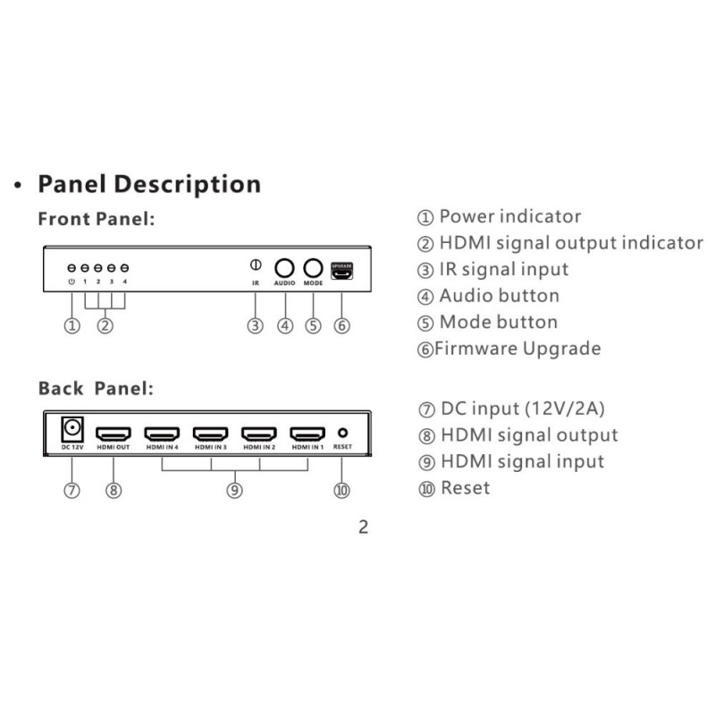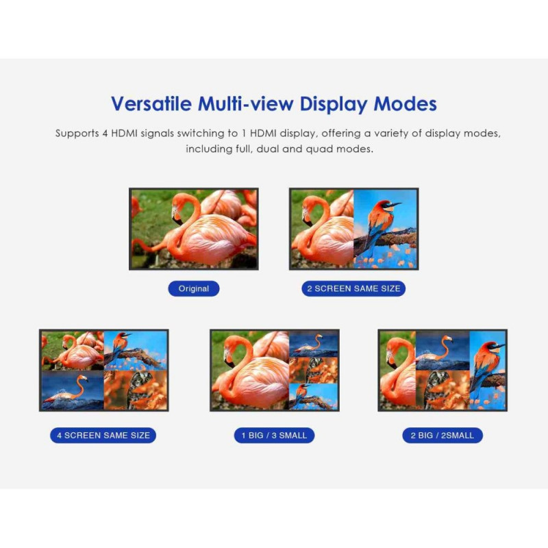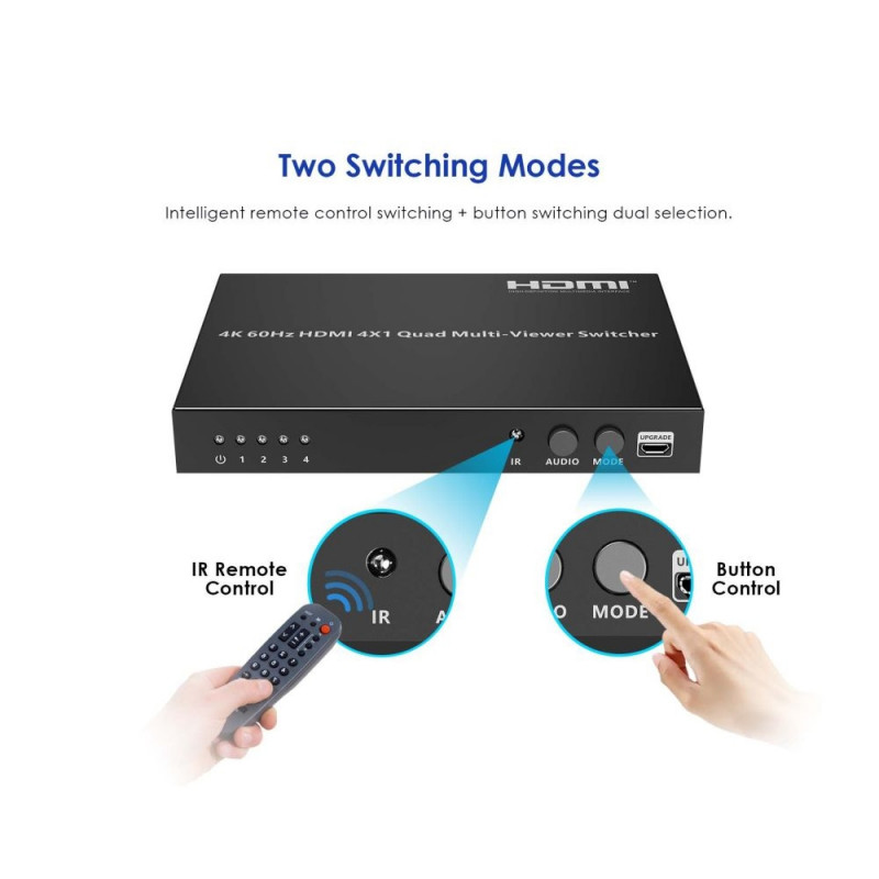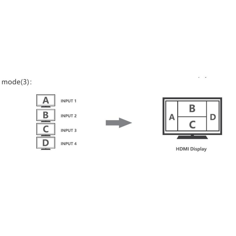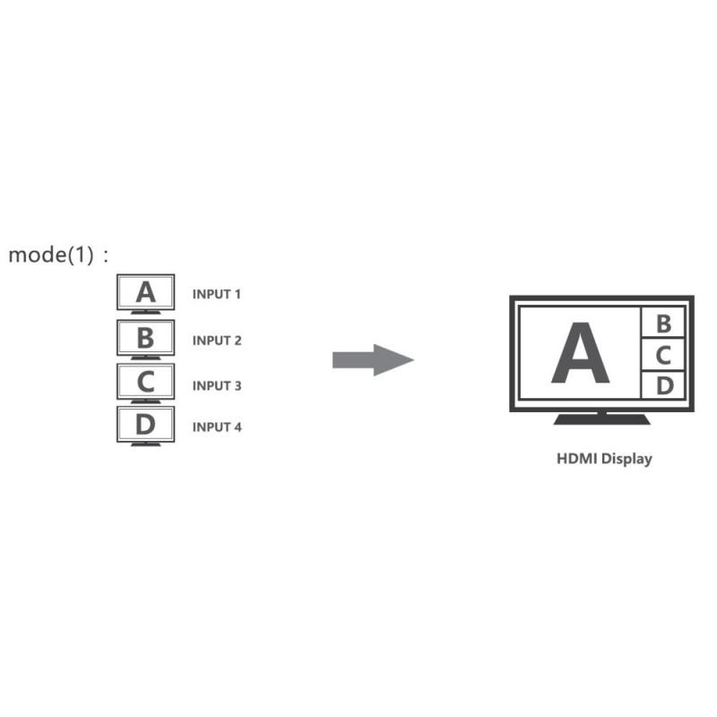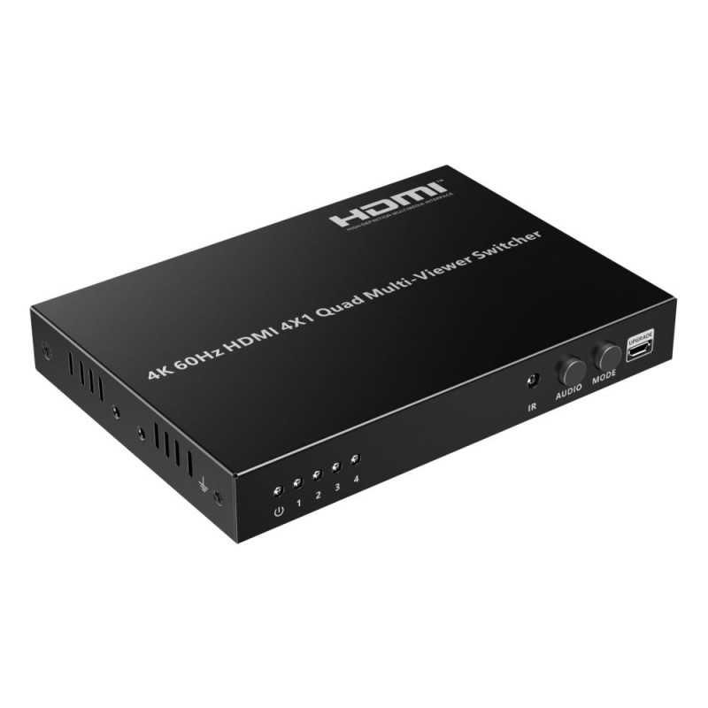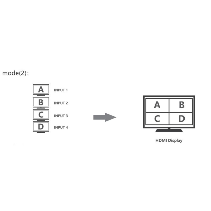 PremiumCord HDMI 4 inputs - 1 output, 4K@60Hz multi display system HDMI 4x1 Quad Multi-viewer is a high-performance switcher and displayer. It allows you to switch inputs to one output and then display all four images on one screen. The images can be switched using a button or IR remote control. It is very practical and simple, easy to install. It can be used as a surveillance system, in conference rooms and other places. - Allows you to display four HDMI signals (four images) individually on one HDMI output (on one monitor). - Allows you to display four HDMI images in segments on one screen. (Video Wall) - It can easily switch between four HDMI signals using a button or remote control. - 4 HDMI input connectors - 1 HDMI output connector . Highest output resolution up to 4K@60Hz (3840x2160@60Hz) and 1080p@60Hz - Supports bandwidth: 18Gbps - Compatible with HDMI2.0 - Supports HDCP2.2 and HDCP1.4 - IR control or front panel button - The remote control has buttons with symbols representing individual display modes - Supports audio output format: LPCM 2.0 and Dolby Digital 5.1, DTS5.1 - Allows you to select five display modes on one monitor. Full screen display, dual mode and 3x quad mode. - Includes DC12V/2A power supply - Consumption: less than 14W - Working temperature: -20°C to 60°C - Housing: metal - Weight: 498g - Color: black - Dimensions: 178mm x 104mm x 21mm - ESD protection, surge protection
