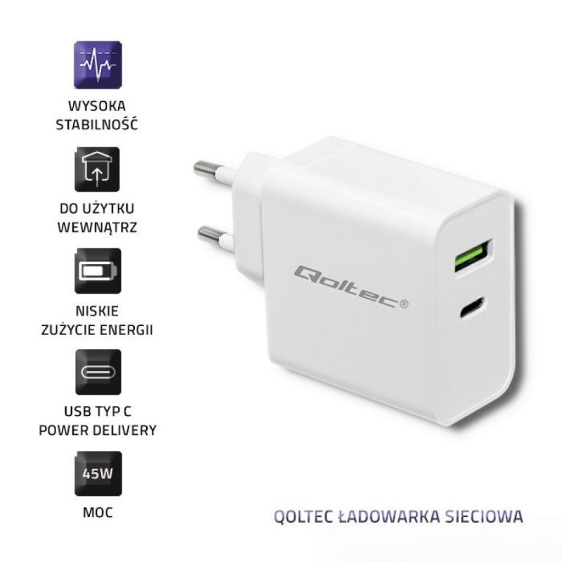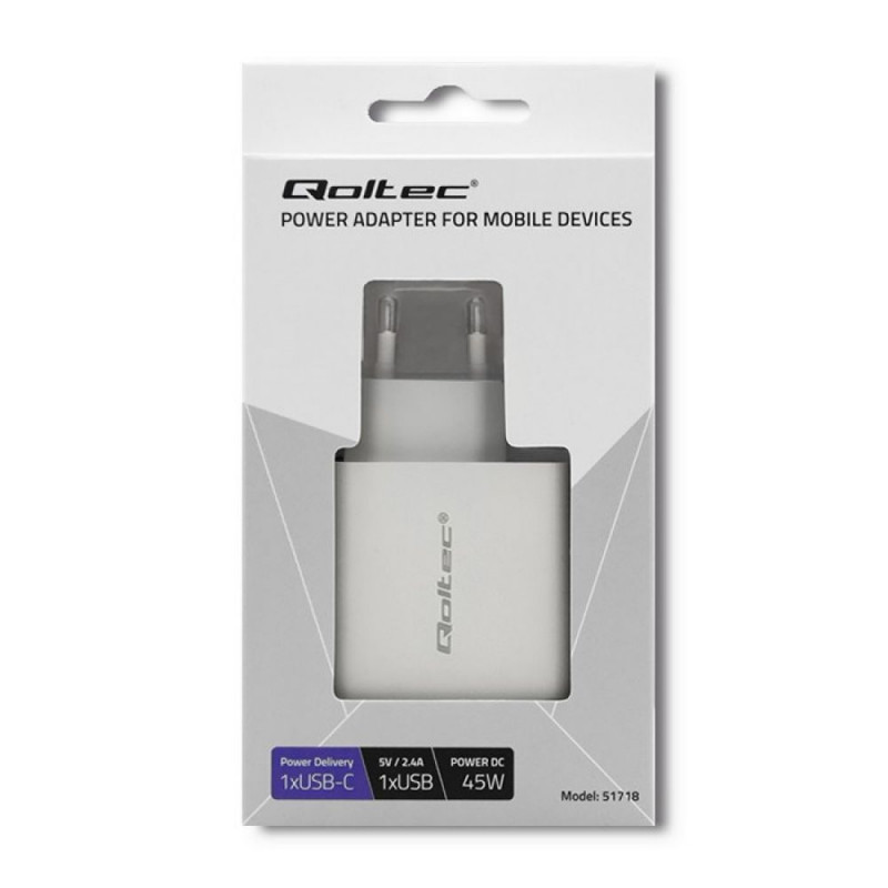 Qoltec 51718 laadija 45W 5-20V 2.4-3A USB Type-C PD USB valge