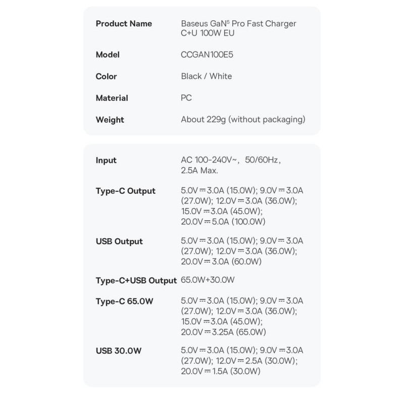 Baseus GaN5 Pro fast universal wall charger GaN USB Type C / USB 100W PD3.0, QC4.0+, AFC black (CCGP