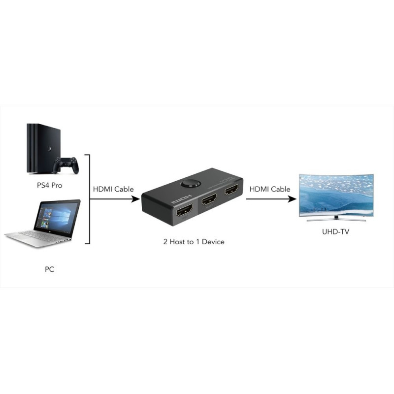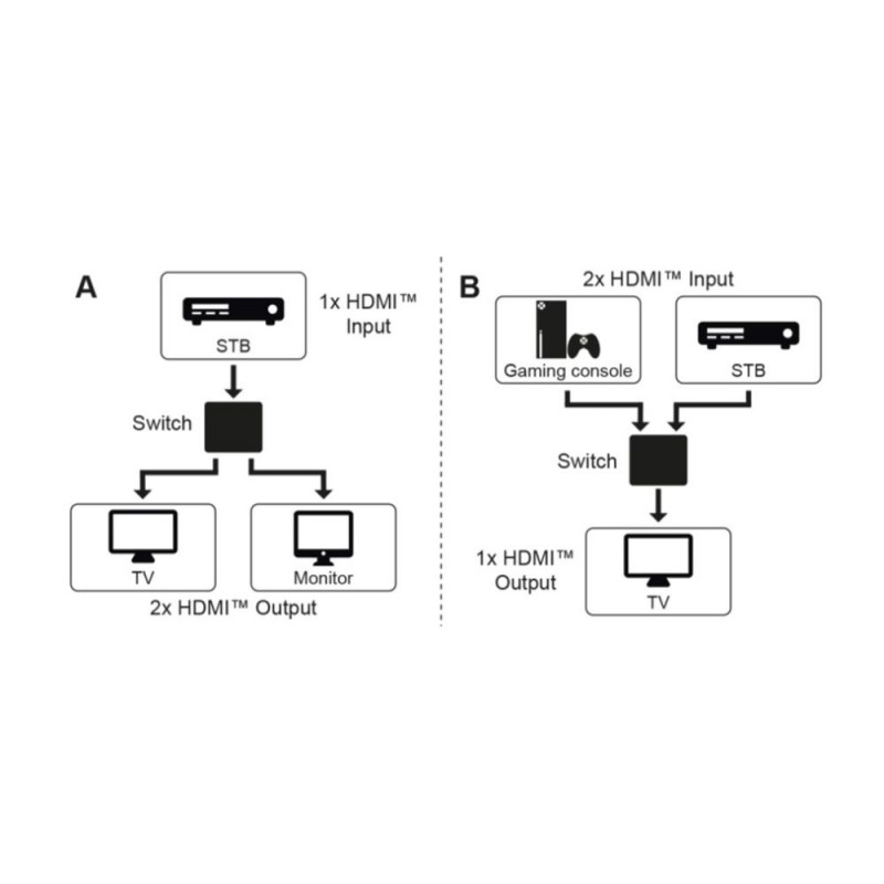 Bidirectional 2x1 / 1x2 The HDMI switch can be used in two different ways | connect 2 input sources with 1 output display or 1 input source with 2 displays (only works on 1 screen, not simultaneously). |