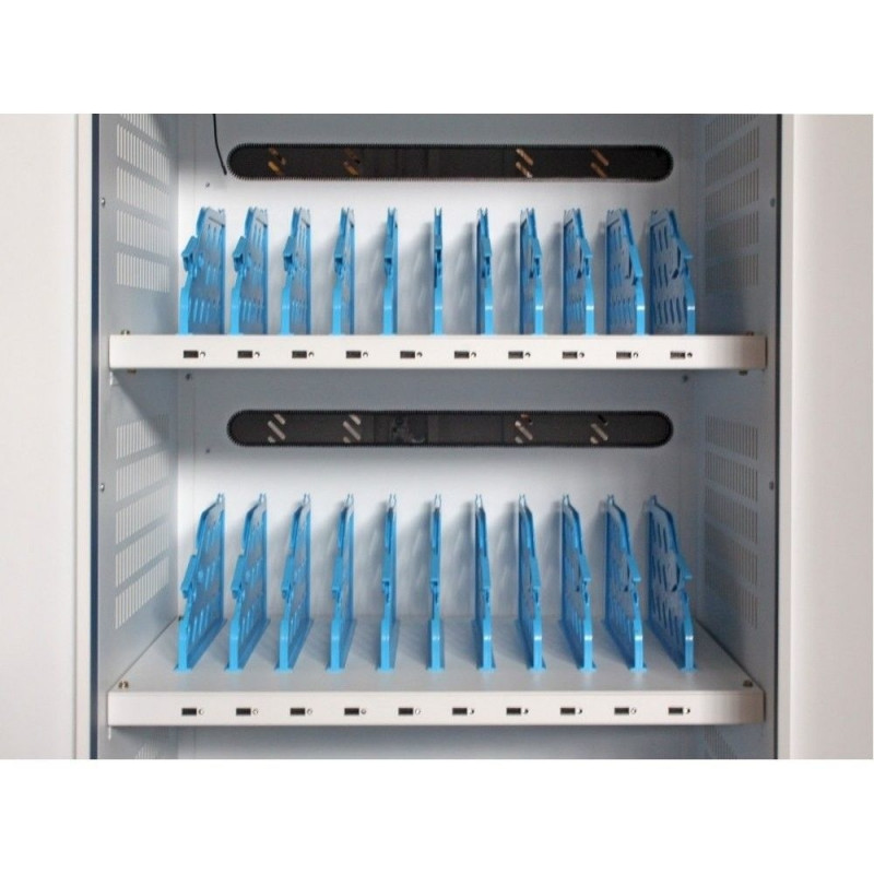 - Varustatud 30 USB-pordiga (5V / 2.1A) kapi esiküljel – igal kolmel riiulil 10 USB-porti