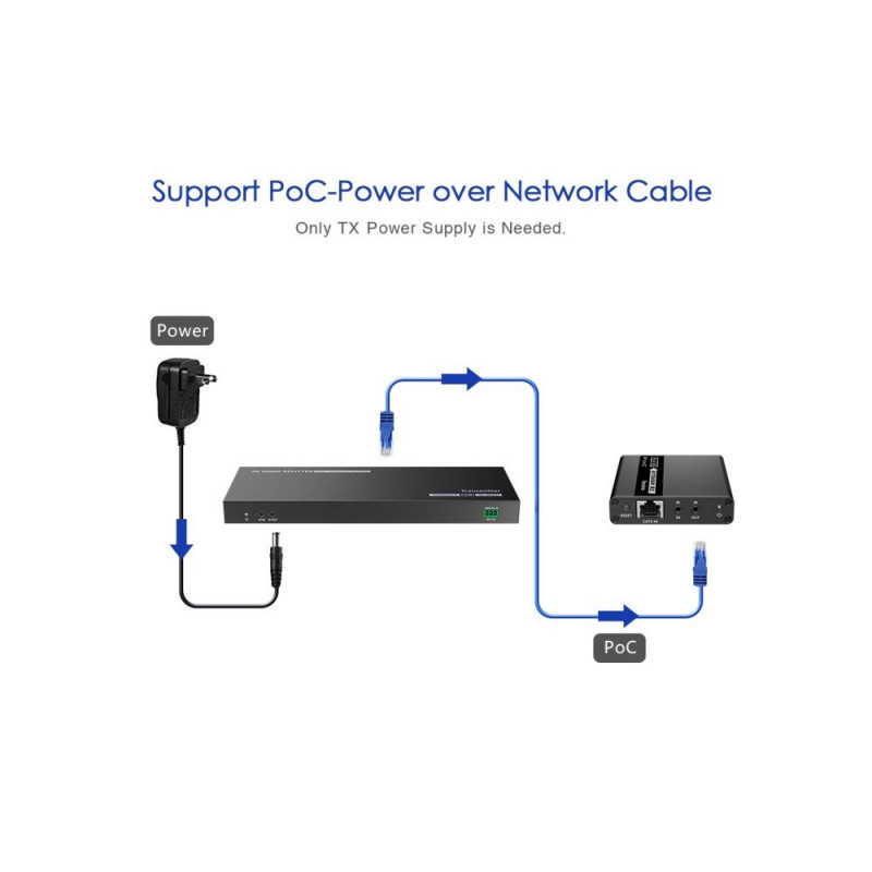 PremiumCord HDMI 1-2 splitter+extender via CAT6/6a/7, UHD 4K@60Hz up to 70m This HDMI extender splitter works with 2 HDMI CAT6 extender receivers to distribute and extend 1 HDMI source to 2 HDMI displays over single CAT6/6a/7 cable up to 70m. The highest resolution supported is UHD 4K@30Hz na 70m, and it supports IR passback, EDID pass through and only one power adapter for the transmitter is needed, the Receiver is powered by the transmitter over CAT6 cable. Ideal solution for HDMI exhibition, Video conference and show center, ect. - Inputs: 1 x HDMI socket (Type A) - Outputs: 1x local HDMI socket(Type A), 2 x HDMI socket (Type A) - Supports 3D and UHD 4K@30Hz a FULL HD 1080p - HDMI1.3, Compatible with HDCP2.2 - Resolution 4Kx2K@30Hz, 1080p ,1080i - Max. Bandwidth (MHz): 340 MHz - Max. transfer rate (Gb / s): 4.95 - Support 20~60kHz IR device - Support EDID manual setting function - Max. resolution: FULL HD 1080p supported color spaces: 16/24 bit RGB/YUV, Deep Color, x.v.Color+ - Supported audio standards: Dolby Digital/Plus, Dolby TrueHD, DTS-HD Master Audio+, DVD-Audio, SA-CD other supported standards: 3D, HDCP, CEC, Full HD (1080i/p), HD ready (720i/p) - Power supply:DC12V/3A - Dimension: TX: 190(L) x 95.9(W) x 23.9(H) mm RX: 71.6×66.6×22.6mm This product comes with 2 HDMI outputs These 2 outputs are synchronous It has the ability of buffering and amplifying The product offers solutions for HDTV retail and show site HDTV,STB,DVD and Projector,noise space and security concerns,data center control information distribution, conference room presentation,school and corporation training environment