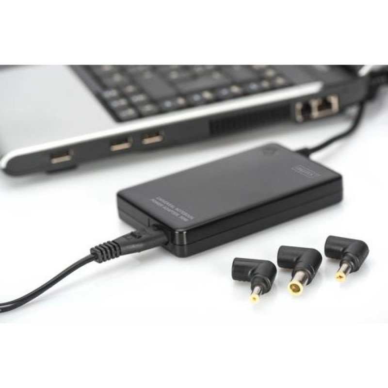 Super slim and compact replacement for defective or lost original power adapters and also perfectly suitable as a secondary power adapter for travel, in the office or at home.<br><br>- Ultra slim, compact and lightweight spare or secondary power adapter - perfect for travel, in the office or at home<br>- 11 different adapters for virtually every notebook<br>- Suitable for notebooks from the most popular brands such as Acer, Dell, Asus, Samsung, Sony, HP, Toshiba, Lenovo, Fujitsu, Compaq, NEC, etc.<br>- Easy and safe selection of the output voltage through the inserted adapter plug<br>- Additional USB charging port for charging mobile devices<br>- Protection against short circuit, overheating, overvoltage and overcurrent<br><br>The DIGITUS Universal Notebook Power Adapter is a super slim and compact replacement for defective or lost original power adapters. It is also ideal as a secondary power adapter for the office, for travel or at home. It offers 11 charging adapters for virtually every notebook from the most popular brands such as Acer, Asus, Samsung, Sony, HP, Toshiba, Lenovo, Fujitsu, IBM, Compaq, NEC, etc. The required output voltage is automatically controlled by the selected matching charging adapter. It also has an additional USB charging port for charging mobile devices such as smartphones, tablets, cameras, etc. Notebooks, as well as the power adapter itself, are protected against short circuit, overheating, overvoltage and overcurrent.Digitus Universal Notebook Power Adapter, 90W. Purpose: Laptop, Power supply type: Indoor, Input voltage: 100-240 V. DC output voltage: +12V, +24V. USB output current: 2 A, USB output voltage: 5 V. Product colour: Black, LED indicators: Activity. Cable length: 1.4 m, Width: 70 mm, Depth: 113 mm