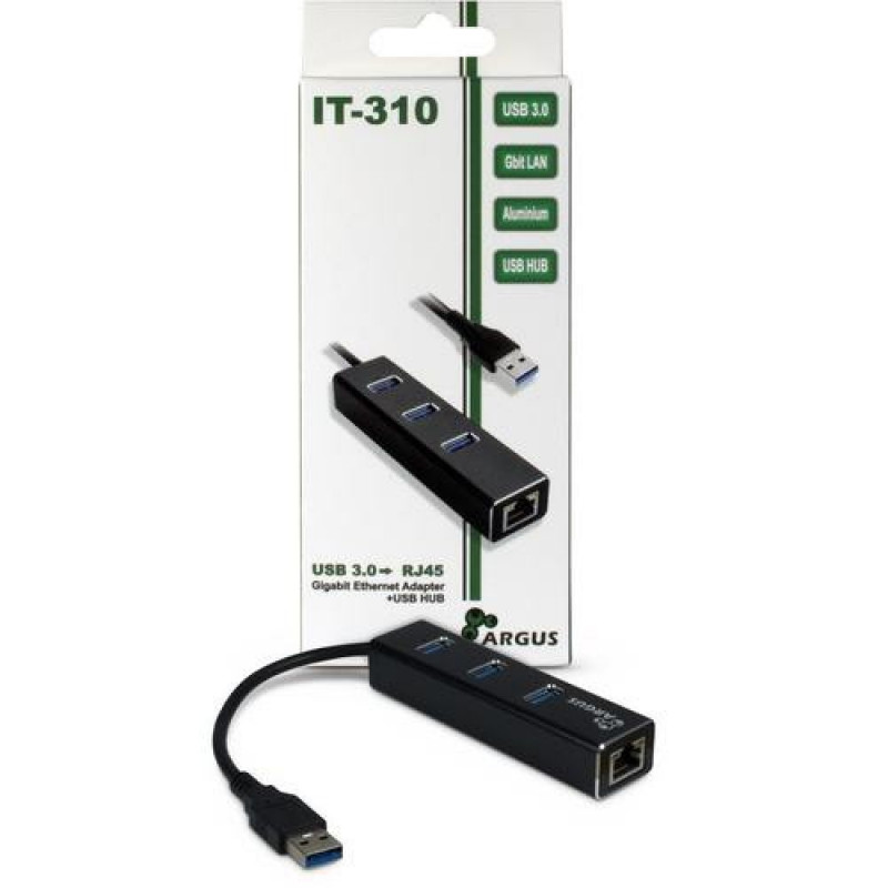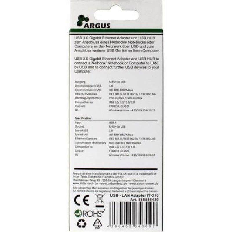 <b>ARGUS IT-310 LAN-ADAPTER</b><br><br>Der Argus IT-310 LAN-Adapter schafft eine Verbindung zwischen Ihrem Netzwerk und einer freien USB 3.0-Schnittstelle Ihres Notebooks/Computers. Neben dem sofort einsatzbereiten RJ45-Netzwerkanschluss bietet der IT-310 zudem noch einen dreifach USB 3.0 USB-Hub. Das Gehäuse besteht aus Aluminium und setzt mit seiner schwarzen Lackierung und polierten Kanten auch optische Akzente.Inter-Tech ARGUS IT-310. Host interface: USB 3.2 Gen 1 (3.1 Gen 1) Type-A. Networking standards: IEEE 802.3ab, IEEE 802.3i, IEEE 802.3u. Product colour: Black, Hub interfaces: RJ-45, USB 3.2 Gen 1 (3.1 Gen 1) Type-A, Housing material: Aluminium. Windows operating systems supported: Windows 10, Windows 7, Windows 8, Windows 8.1, Mac operating systems supported: Mac OS X 10.6 Snow Leopard. Width: 28 mm, Depth: 20 mm, Height: 270 mm