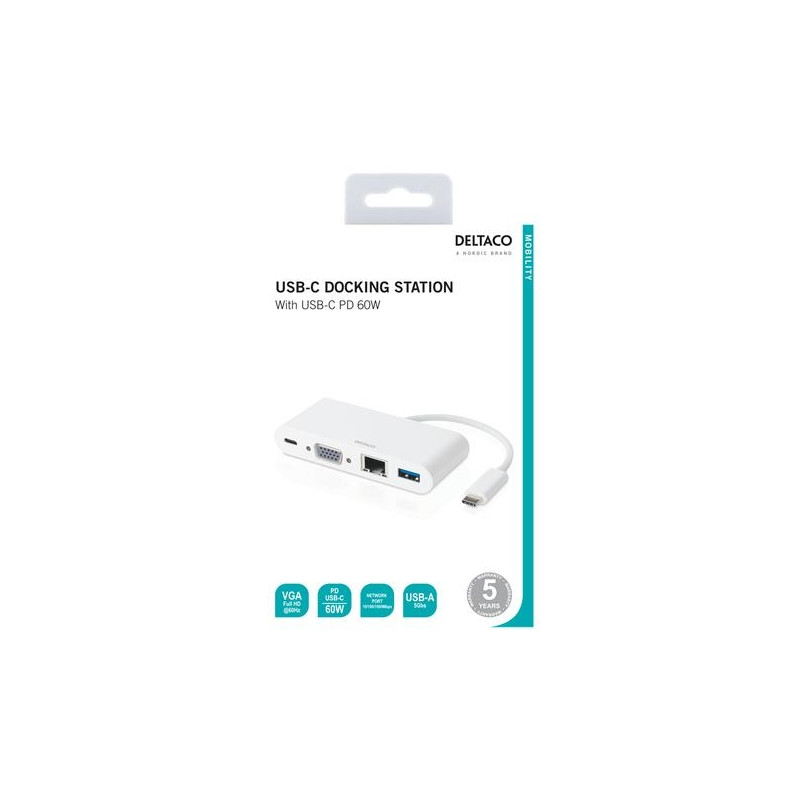 This USB-C docking station has a VGA port that supports resolutions up to 1920x1200, a USB-A 3.0 port with BC 1.2, a Gigabit RJ45 port and a USB-C port with USB-C PowerDelivery 60W.Deltaco USBC-VGA5. Host interface: USB 3.2 Gen 1 (3.1 Gen 1) Type-C, USB Power Delivery up to: 60 W. Product colour: White, Hub interfaces: RJ-45, USB 3.2 Gen 1 (3.1 Gen 1) Type-A, USB 3.2 Gen 1 (3.1 Gen 1) Type-C, VGA. Power supply type: USB. Width: 95 mm, Depth: 41 mm, Height: 17 mm. Quantity per pack: 1 pc(s)